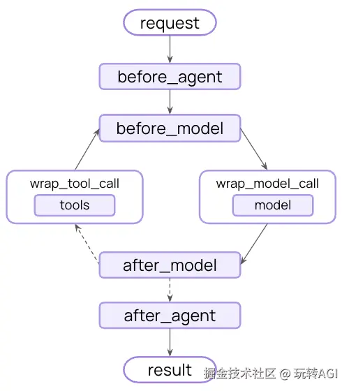 Middleware 是 LangChain 1.0 从原型到生产的核心桥梁。它在 Agent 执行循环的战略节点暴露钩子函数,让开发者无需重写核心循环即可注入自定义逻辑 —— 这种设计类似于 Web 服务器中间件的对称处理模式。