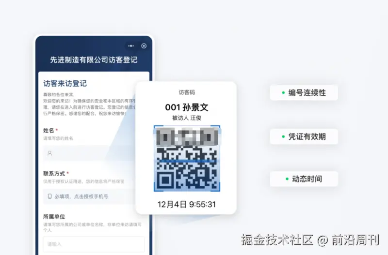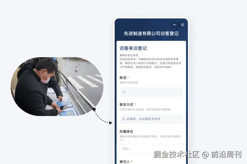 访客也可以提前扫码填写并提交申请,管理员在后台审核后即可生成访问凭证,到场时扫码核验即可。