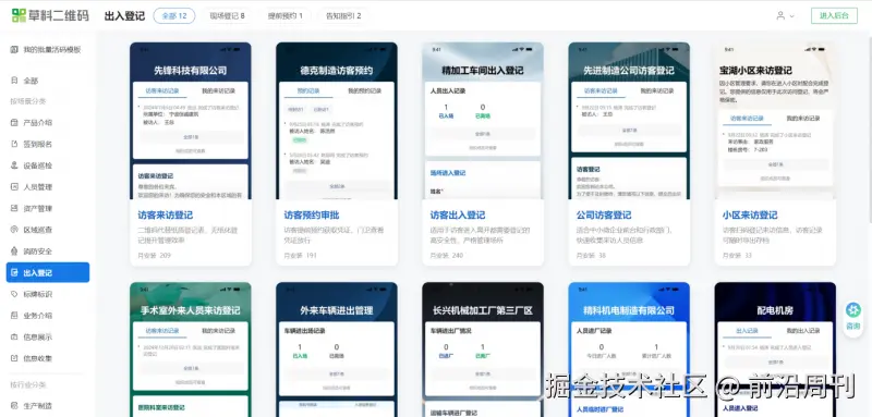 在电脑端进入草料二维码官网。平台提供了多个【出入登记】和【访客登记】模板,可直接选用。