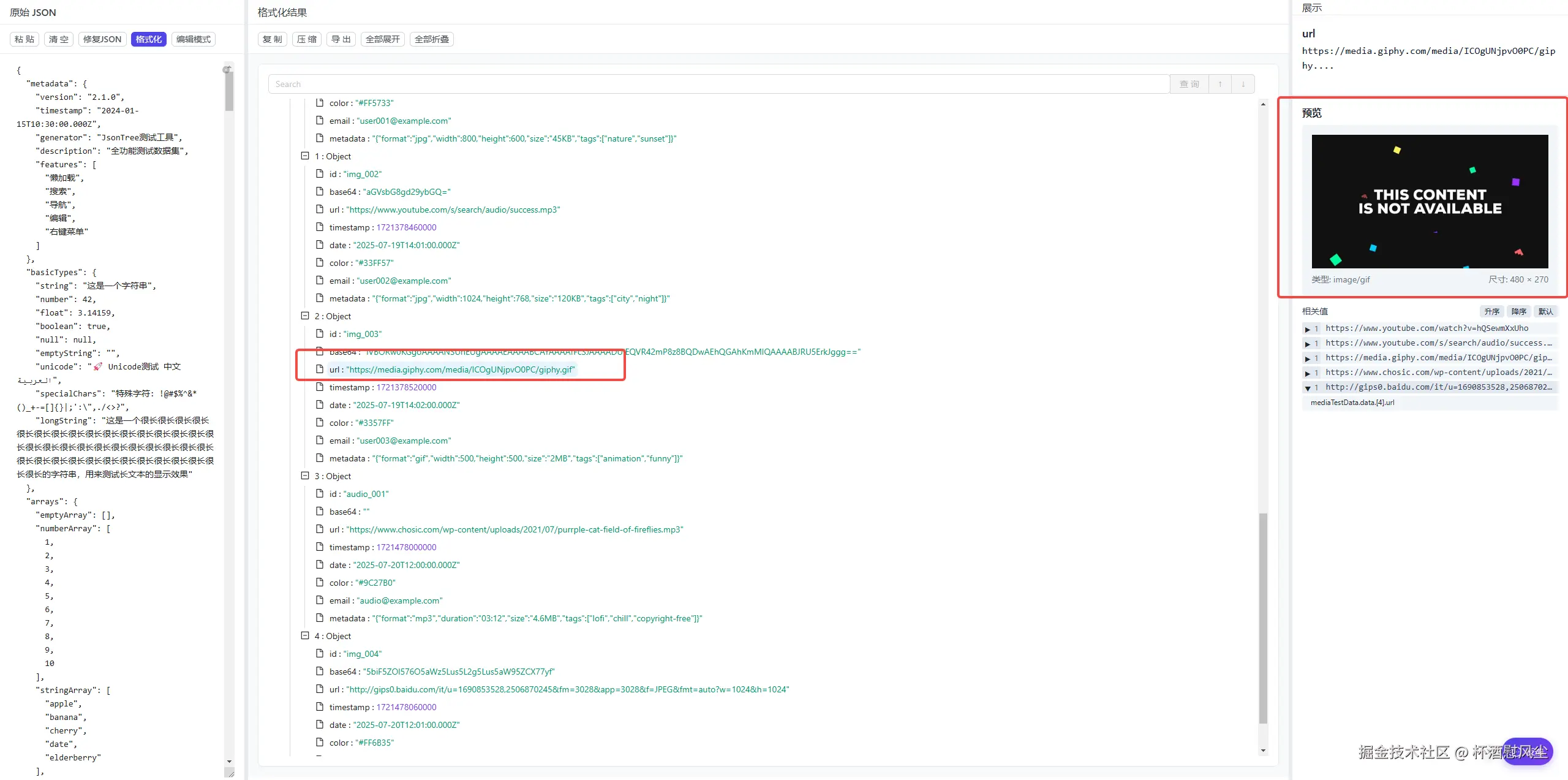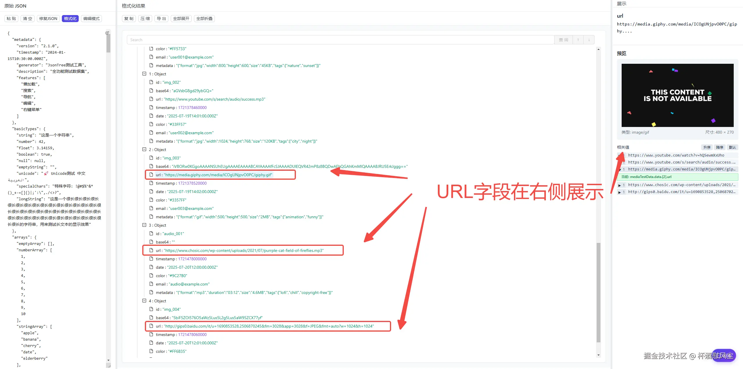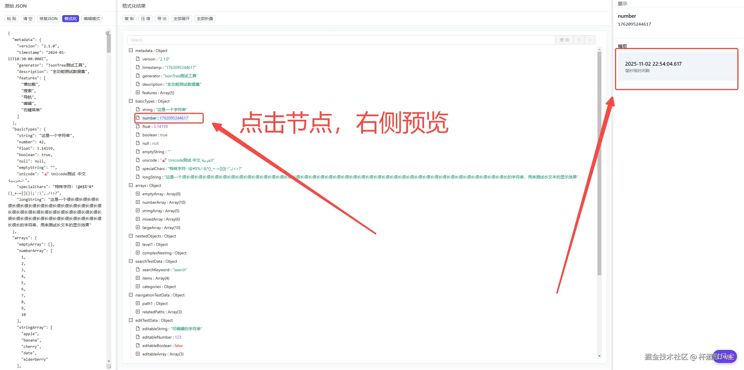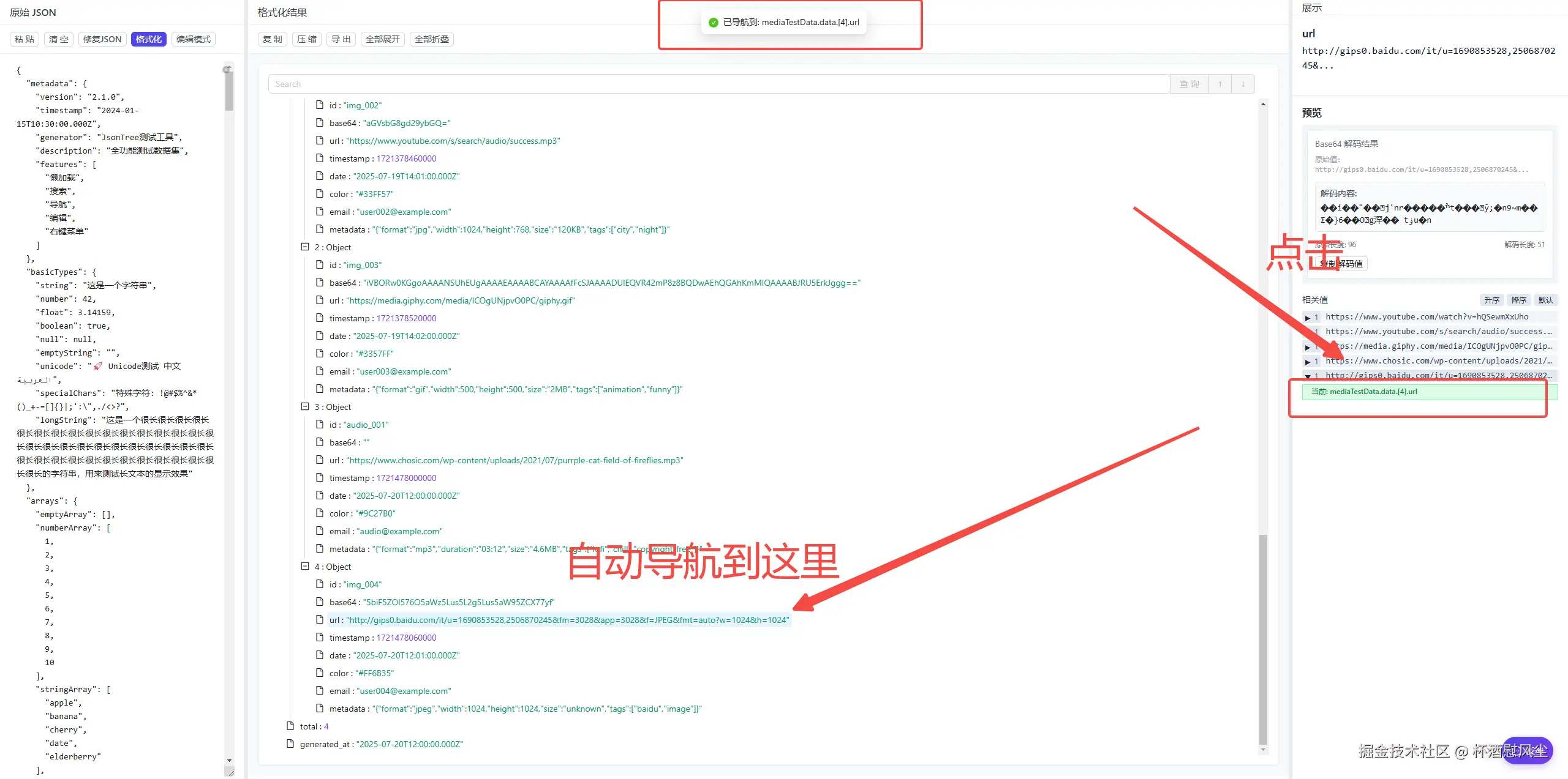 展示功能是为了点击JSON节点,快速预览JSON值,比如说JSON节点中的值是个时间戳,假设想知道时间戳对应的具体时间还得把时间戳复制下来再去其他工具查看时间戳对应的具体时间,而在本工具直接点击节点,右侧直接会显示格式化的时间,除此之外还能预览图片、BASE64编码。