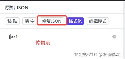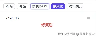 有时候我们拿到一串json数据可能格式有点问题,比如说少个},使用key没用双引号等原因导致json格式化错误,这个时候可以试着点击一下”修复JSON“按钮。