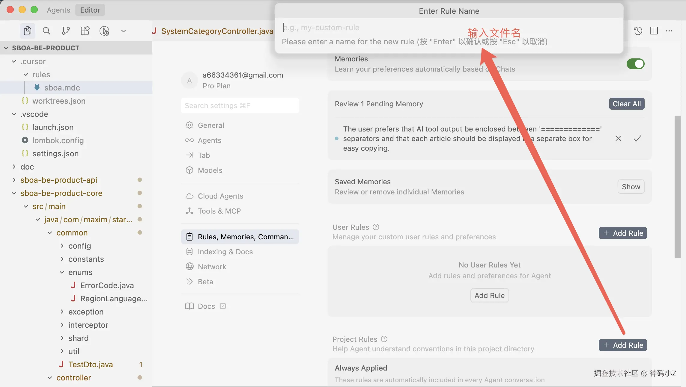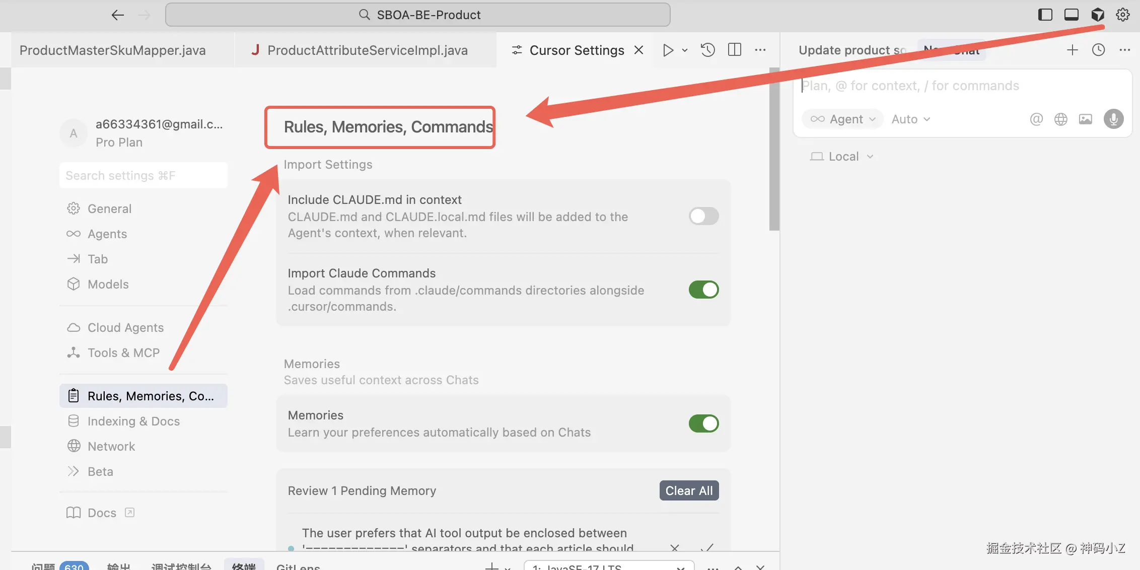 本文我将结合个人经验,和大家分享下如何使用 Cursor 的三大功能 —— Rules(规则)、Memories(记忆)和 Commands(指令),实现后端的高效率开发!