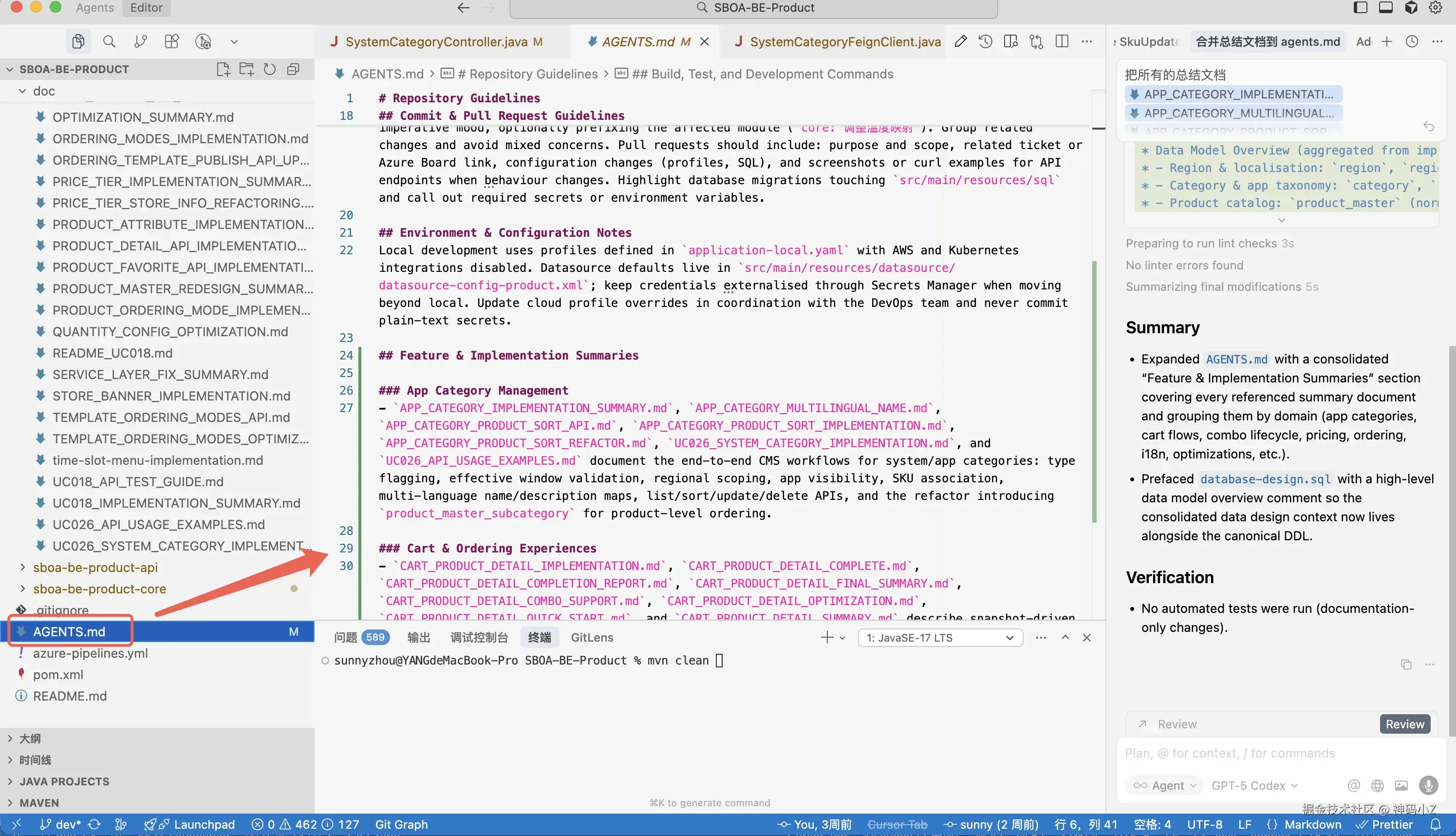 对于一般后端项目,如果不想一开始就引入复杂的 Memory Bank,强烈推荐使用一个简洁的方案:****创建 AGENTS.md 文件。使用过 CodeX (openAI 推出的 Code CLI 工具,和它等效产品有:Claude Code、阿里的 Qwen Code、腾讯的 Code Buddy Code)工具的伙伴们应该比较熟悉,它的第一条快捷命令就是 /init,会在当前目录生成一个 AGENTS.md 记录整个文档的结构!
