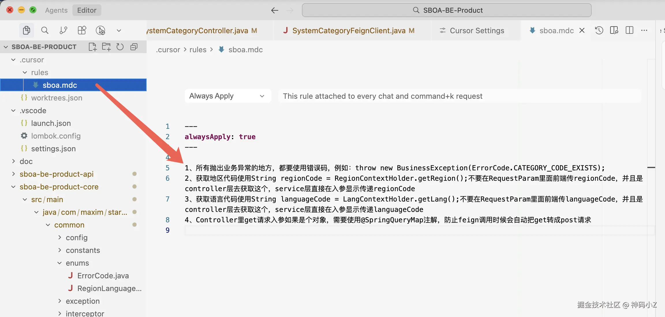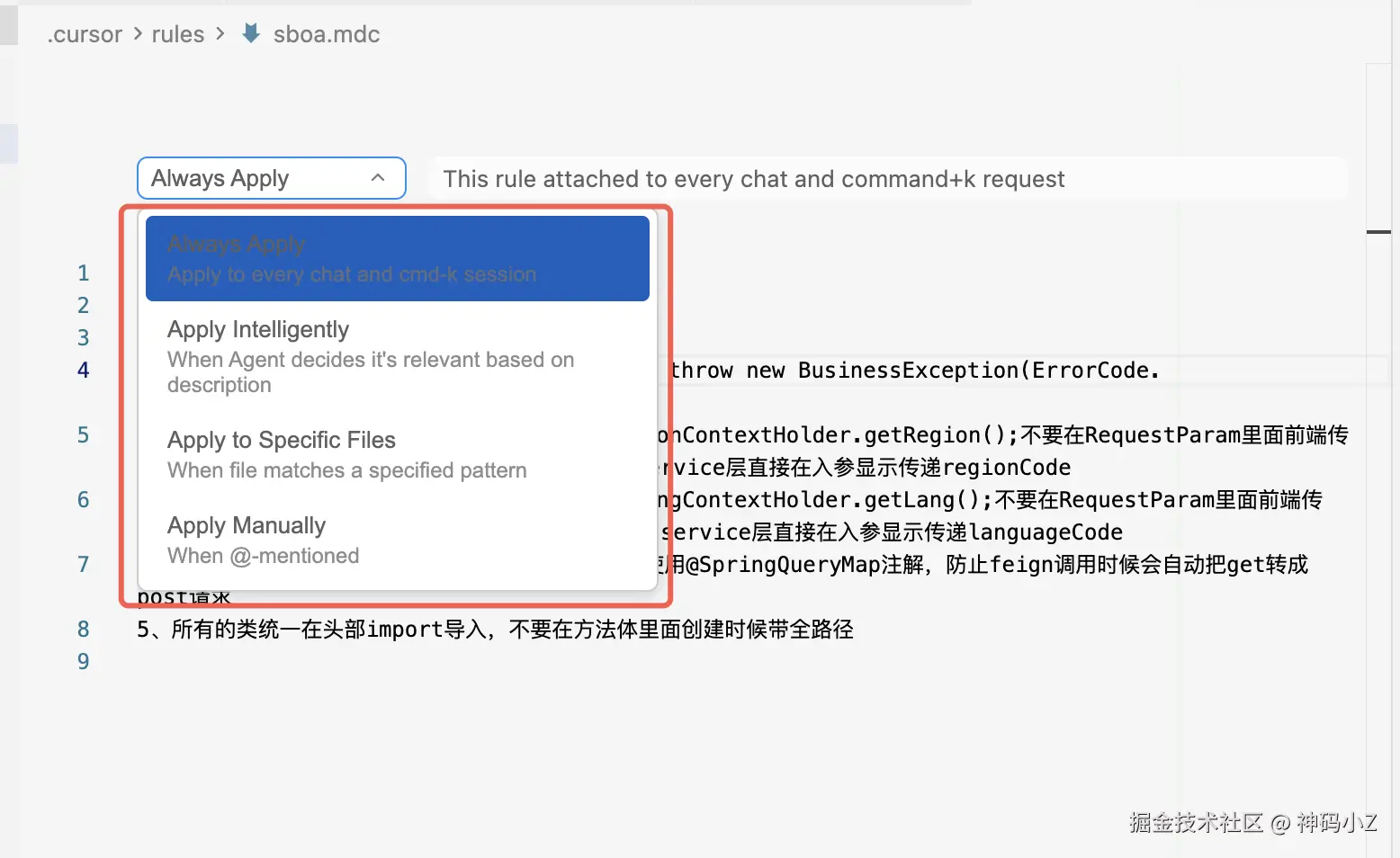 在这个.mdc 文件里你可以把自己的规则写到此处!例如:我这里代码多语言是从 ThreadLocal 去获取的,接口不要使用@RequestParam让前端传过来,这样 AI 在进行开发时候会优先读取这个规则,然后按规则去编写代码!