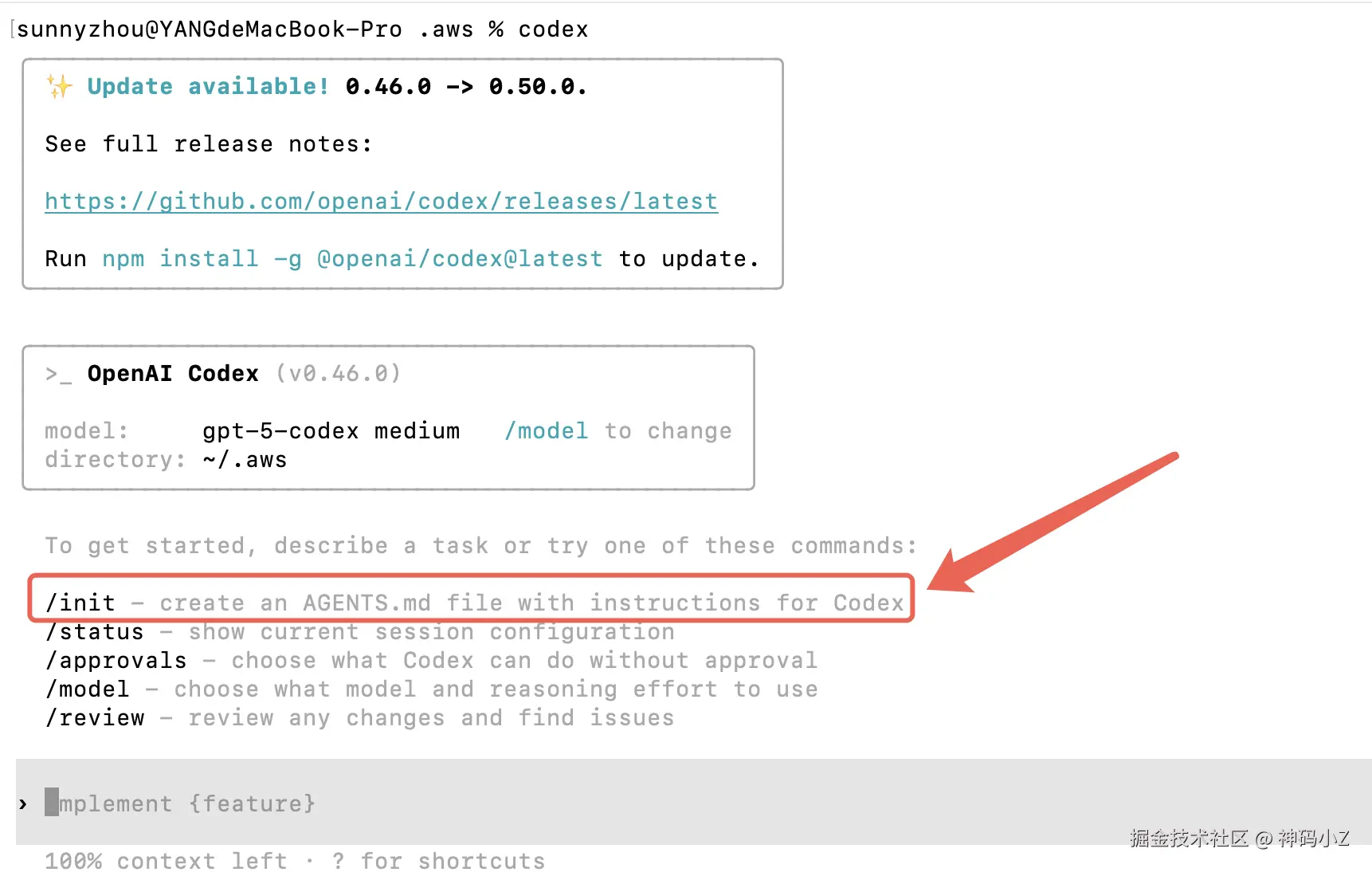 技巧: 如果你已有一定规模的项目,不妨借助强大的 GPT 模型来生成 AGENTS.md 初稿。例如,可以使用最新的 GPT-5-CodeX 模型,让它基于项目代码生成一份结构化说明文档,我一般都是直接使用 CodeX,在根目录执行下 /init 去进行生成!