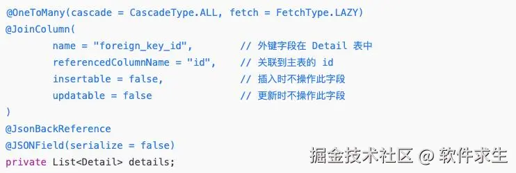 以前我用了 mappedBy,代表让子类(Detail)去维护外键;但现在,我改成了 @JoinColumn,相当于告诉 JPA:“我自己来指定外键字段。”