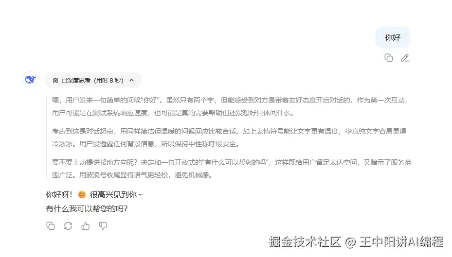 CoT(Chain of Thought)思维链是一种让 AI 像人类一样 “思考” 的技术,帮助 AI 在处理复杂问题时能够按步骤思考。对于复杂的推理类问题,先思考后执行,效果往往更好。而且还可以让模型在生成答案时展示推理过程,便于我们理解和优化 AI。