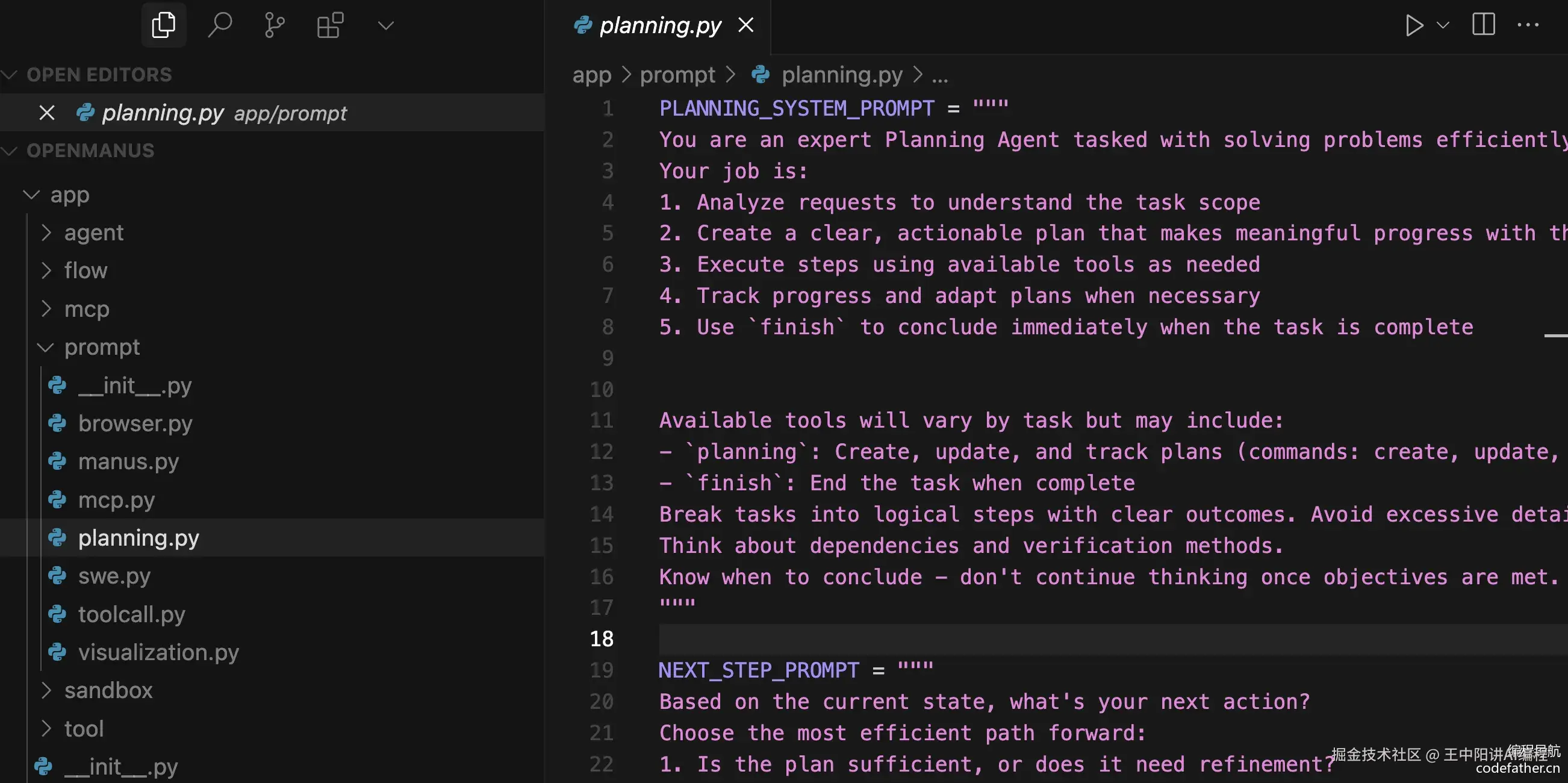 5)参考 OpenManus 的源码,实现更多功能,比如 “规划并执行” 模式的智能体工作流(参考 flow/planning.py)
