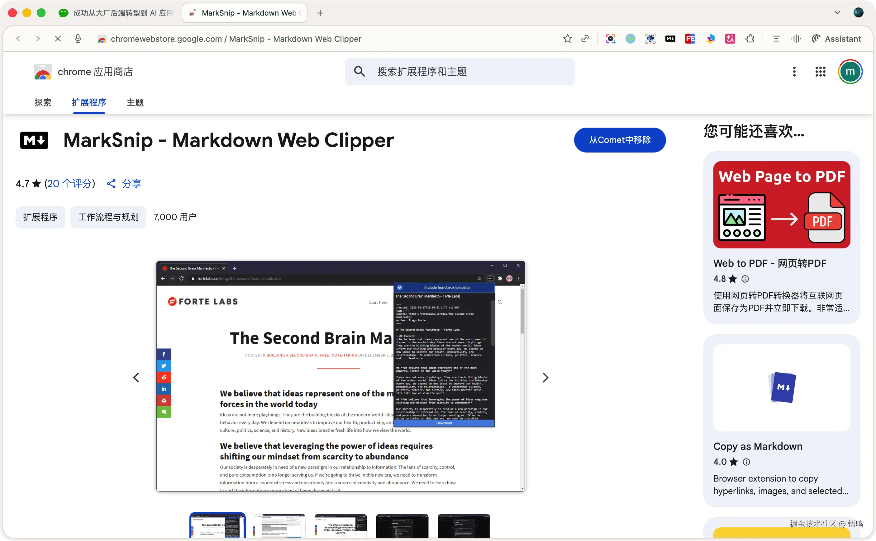 那么我们可以安装这个 MarkSnip 浏览器插件,可以轻松地把当前网页上的内容进行复制,或者下载为 Markdown 格式的文件。