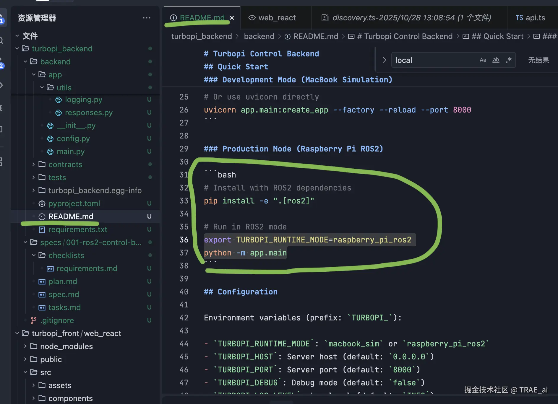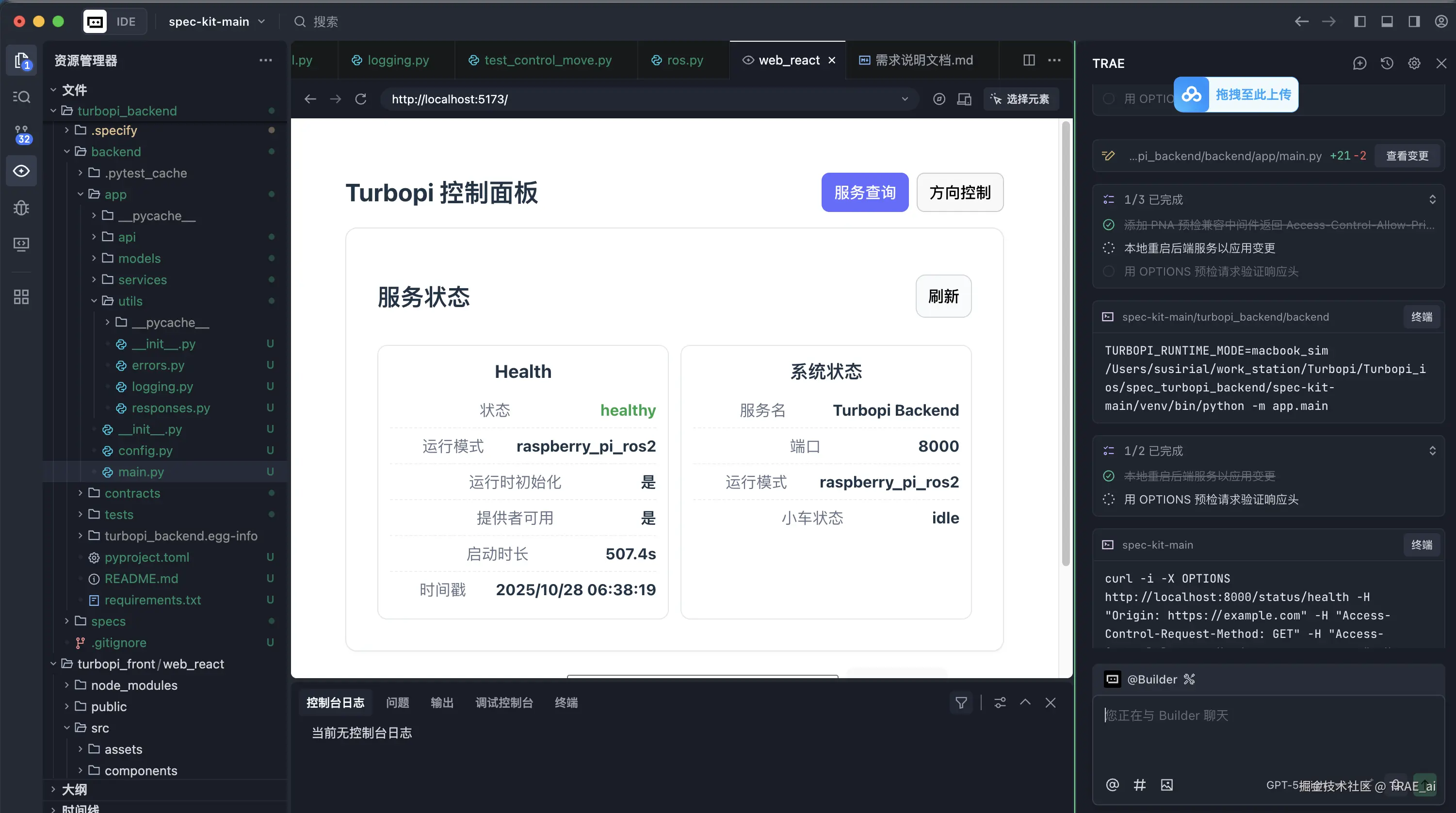 把后端代码拷贝到树莓派小车,然后根据项目 README.md (TRAE 写代码时生成) 安装、启动后端服务。