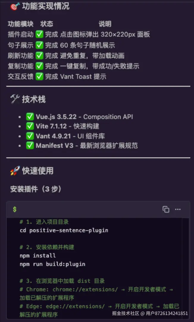 | 适用范围 | 前端开发人员、测试人员 | 核心目标 | 开发一款轻量型浏览器插件,支持随机展示正能量句子及复制功能 |