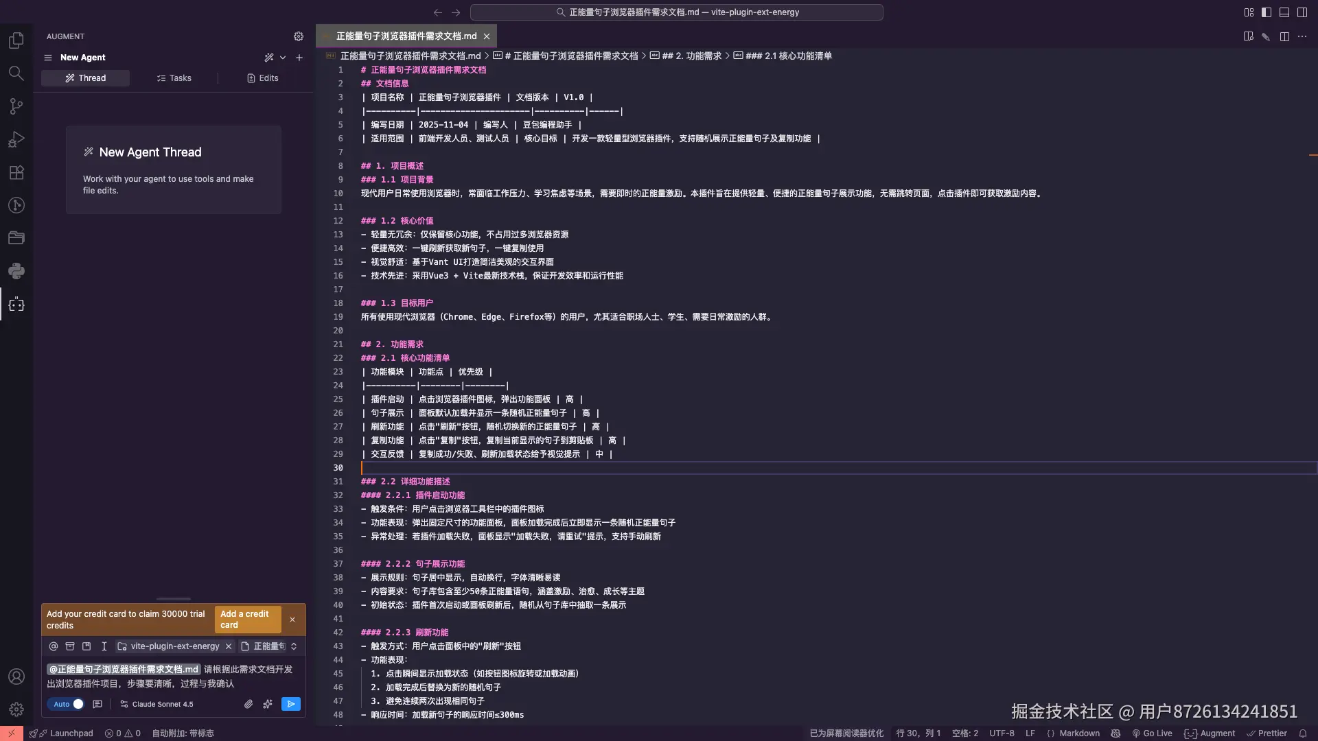 在augment code插件中选中需求,并给ai布置任务,这边使用的是最新的Claude Sonnet 4.5