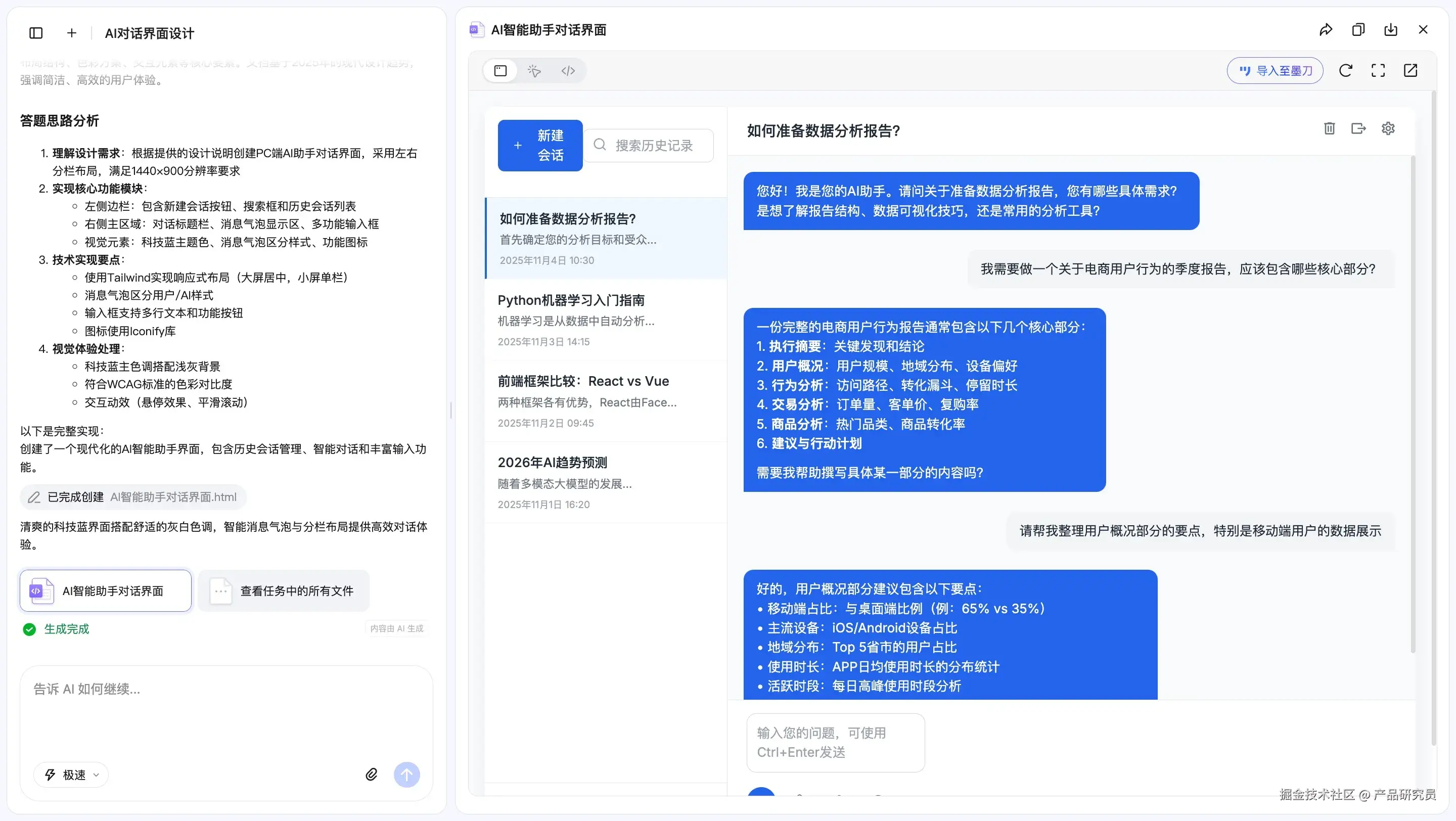 两款工具都支持输入文字Prompt,以及通过草图、截图的方式生成原型图,也都支持AI对话式多轮优化。不过相比之下,墨刀AI Agent在生成原型图时会自动联系上下文,比如上文中的产品调研情况以及设计需求,能保持统一产品逻辑,更加深度理解产品需求。FigmaMake没有关联上下文能力,根据输入而生成界面。