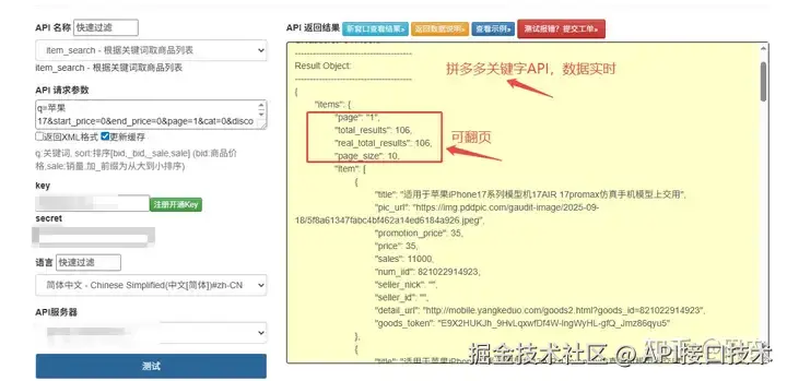 设置请求参数:在API请求中,您需要设置关键词以及其他必要的请求参数,如页码、每页数量等。这些参数的具体值可以在拼多多开放平台的官方文档中找到。