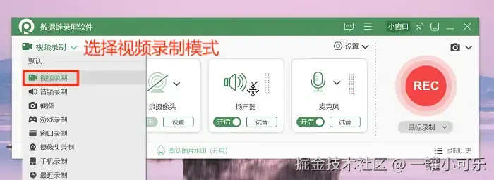 步骤2:根据个人需求设置录制区域、音频来源等参数。还可以开启图片水印录制哦。设置完毕后,点击 “REC” 按键开始录制。