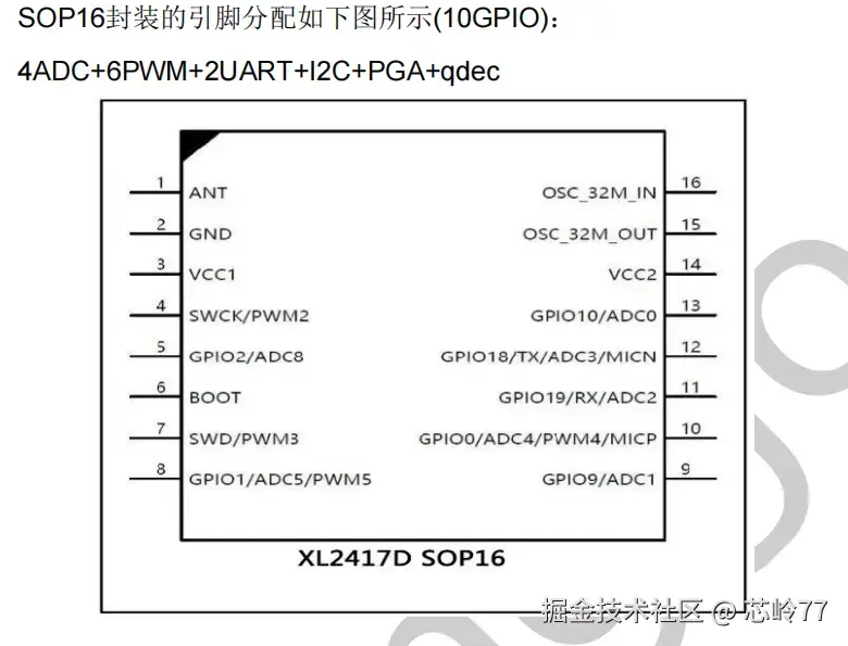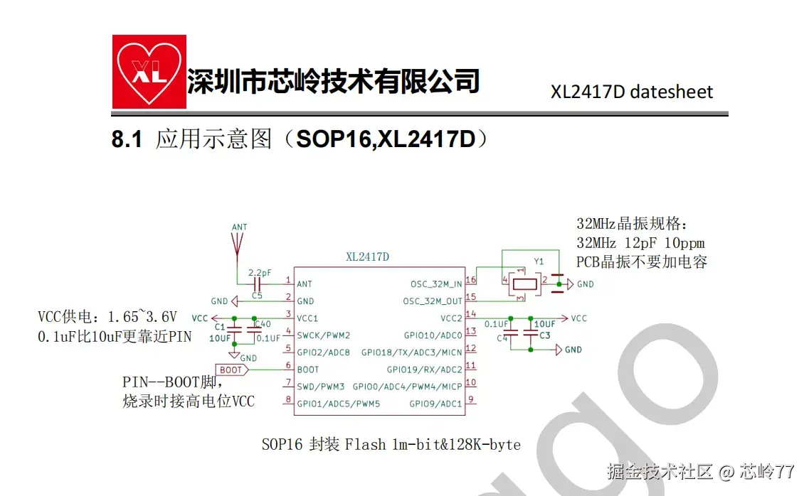 XL2417D芯片是一款低功耗、高性能和高度集成的SoC,带有2.4G收发器。它集成了高性能2.4GHz射频收发器、丰富的基带功能、32位MCU和各种外围IO。它支持128KB的flash和8KB的RAM,以实现可编程协议和配置文件,支持定制应用程序。