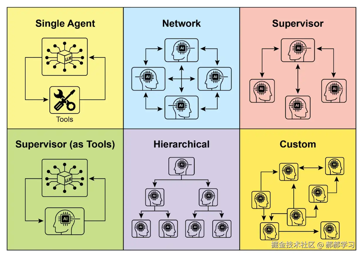 层级型:多层监督者结构,高层监督者管理低层监督者,底层为操作智能体,适合复杂问题分层管理,便于扩展和分布式决策。