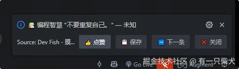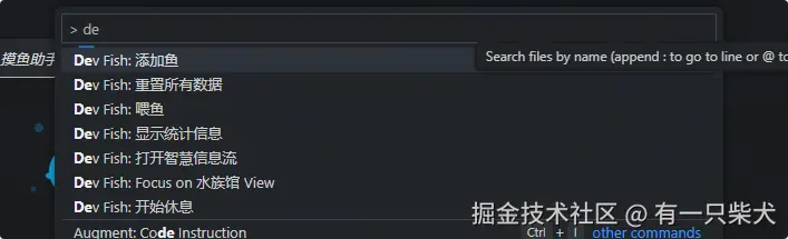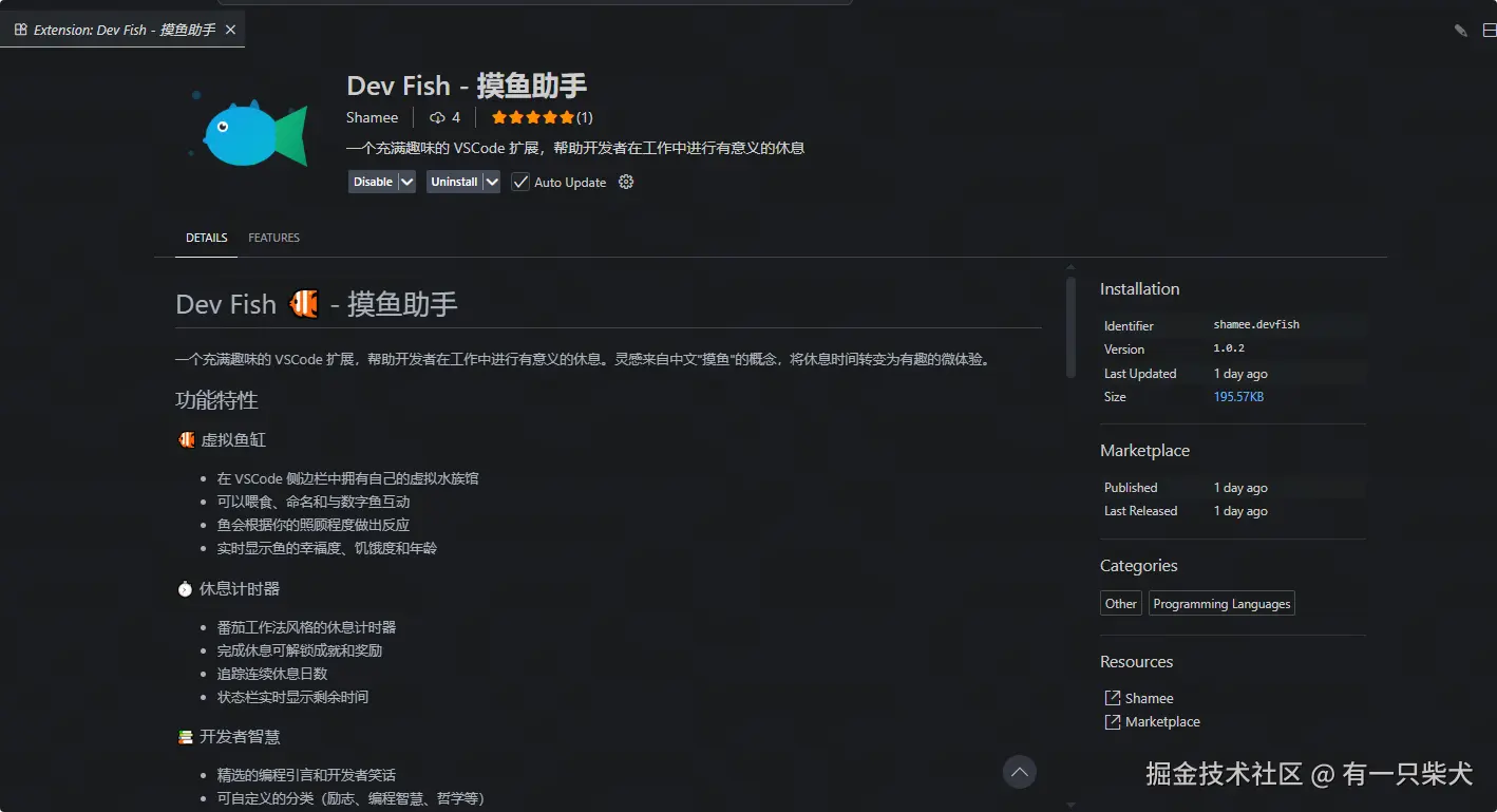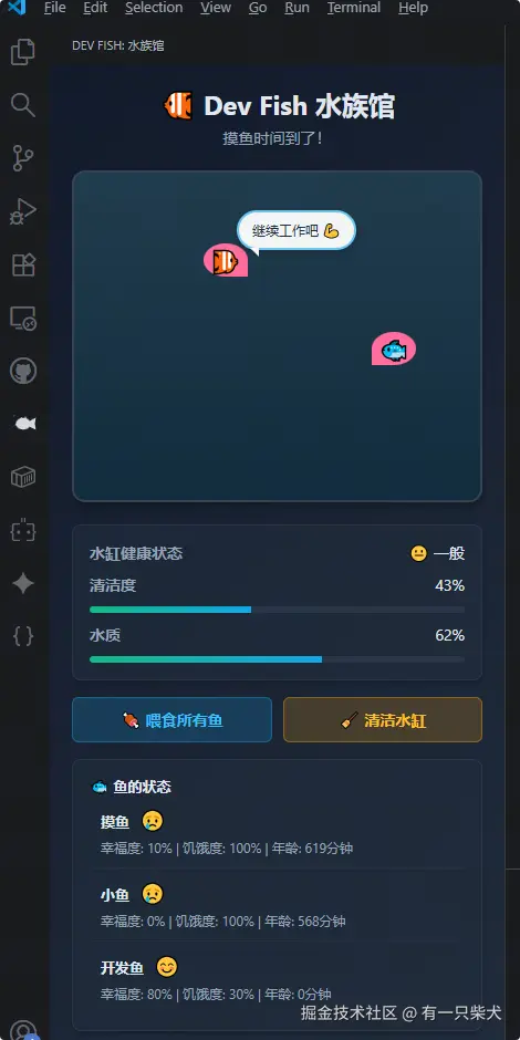 Dev Fish 就是一款把“休息”包装成“养鱼”的插件。装完之后,VSCode 侧边栏会多一个鱼缸: