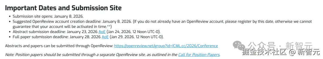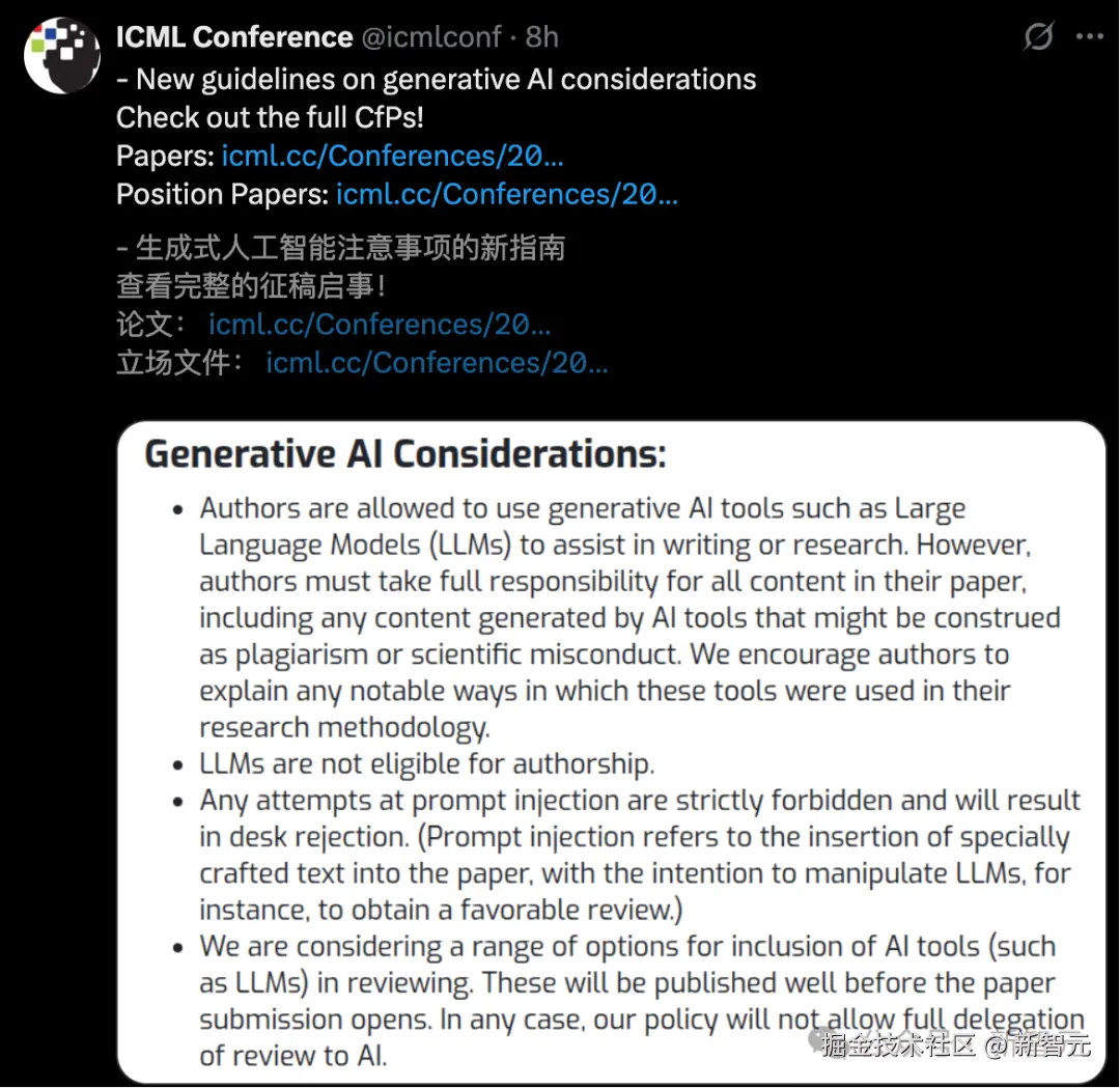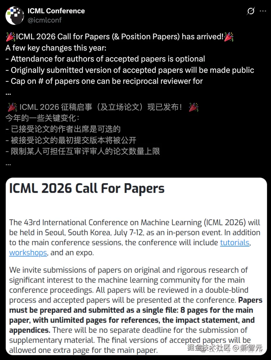 「【新智元导读】ICML 2026 论文可以投了,截止日期 2026 年 1 月 28 日。今年针对 AI 使用,组委会强调了三点:LLM 不可以「署名」;严禁提示注入,否则拒稿;以及扩大 AI 审稿。」