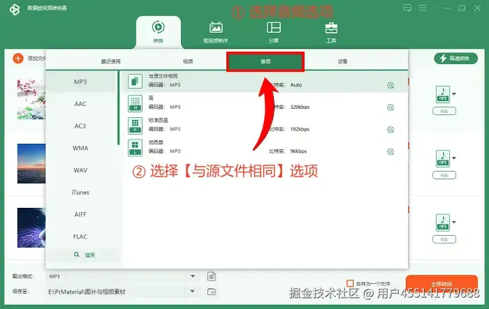 第二步: 选择转换mp3格式。点击对应flv视频文件右侧的格式设置图标,就可以看到各项可供选择的格式了。点击音频,选择MP3子目下的 【与源文件相同】 选项。