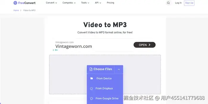 FreeConvert是一个文件转换网页,可供选择的格式十分多样,而且罕见地支持视频文件转mp3的选项,这就与我们的需求不谋而合了。这个格式转换网站的操作流程十分简单,总体上同样是上传文件、选择格式、下载文件这三个主要的步骤。