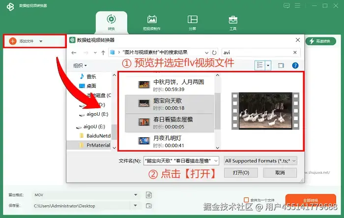 第一步: 上传flv格式视频文件。打开软件的主界面之后,看到界面左上方的【添加文件】选项,点击之后在弹窗中单选或多选flv视频文件。