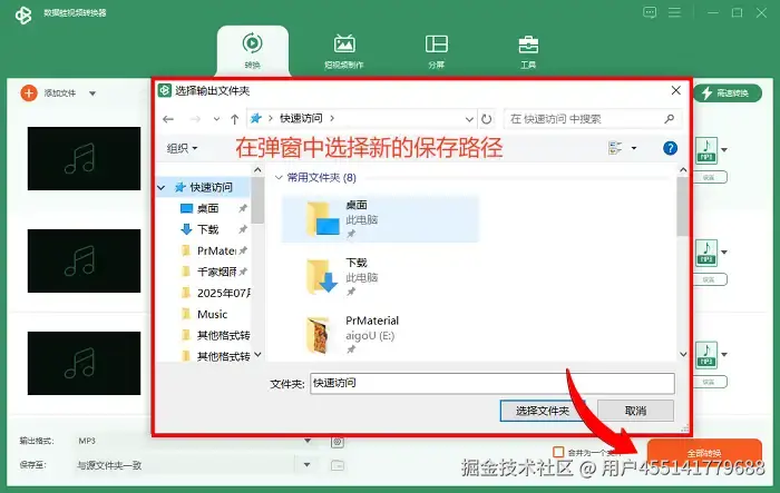 第三步: 选择保存位置并导出mp3文件。格式选择完毕后,点击左下角的 【保存至】 选项,修改默认的保存路径,最后点击 【全部转换】 即可导出mp3视频。
