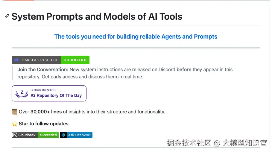 在AI Agent开发领域,一个名为 system-prompts-and-models-of-ai-tools的GitHub Repo斩获10万+⭐️Star,高居趋势榜第二,成为了开发者学习Agent设计的“圣经”。
