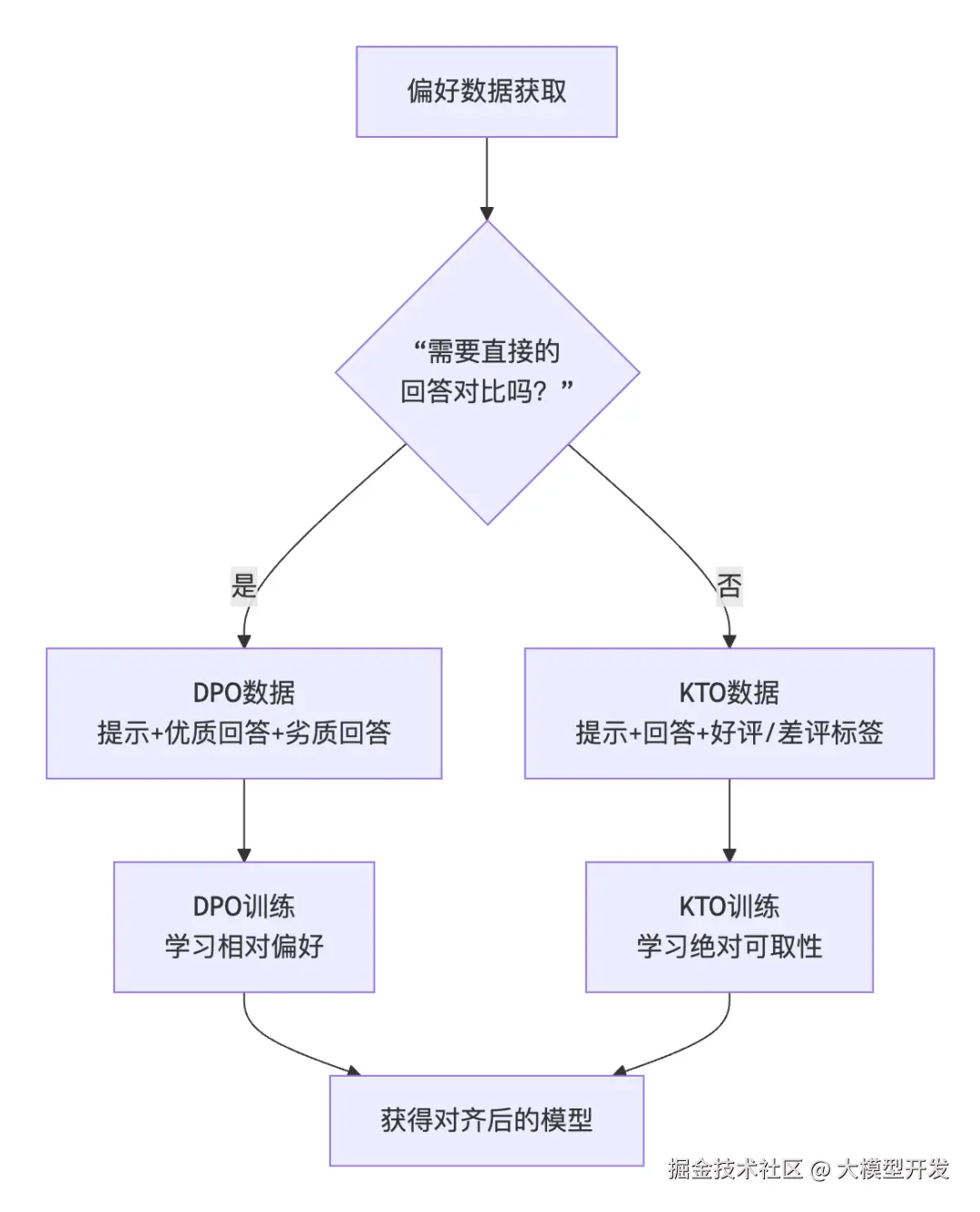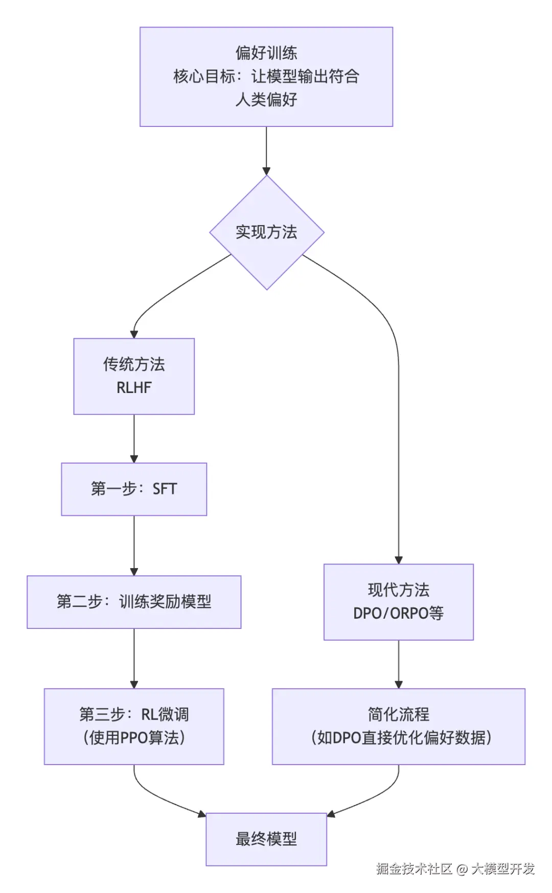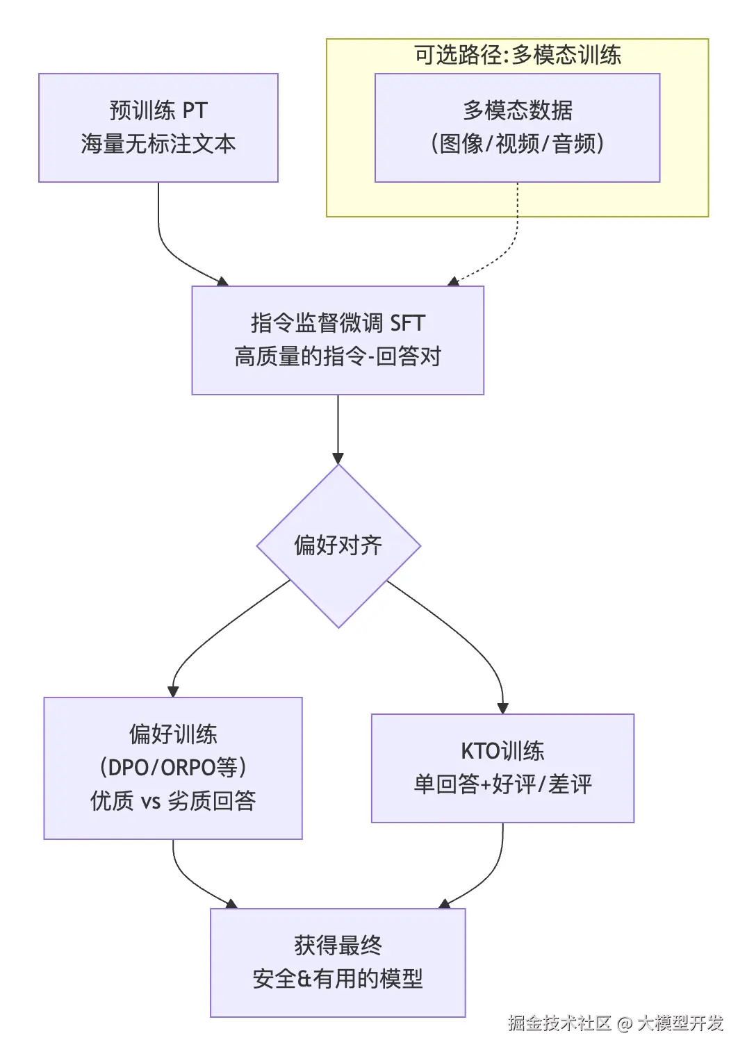 这是微调的高级阶段,目标是让模型回答不仅正确,而且安全、简洁、符合人类偏好。主要分为两种路径:偏好训练和KTO训练。
