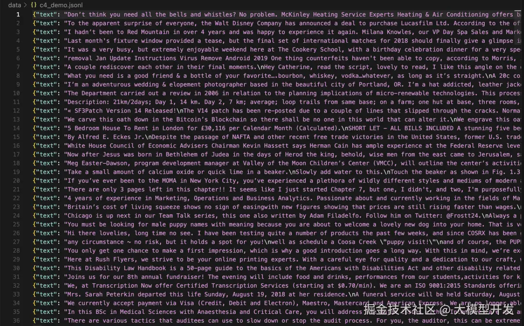 {"text": "...很长的一段文本..."}。每一段文本都是一个完整的内容单元(如一篇文章、一个网页)。