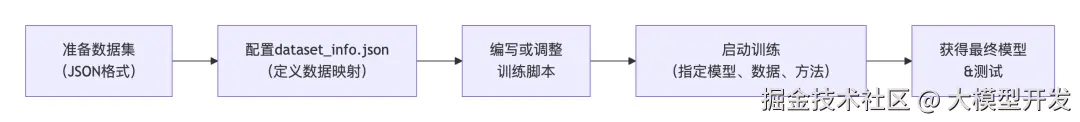 LLamafactory 等项目极大地降低了微调的门槛,让我们可以在单张消费级显卡上高效微调大模型。实战流程可以概括为以下关键步骤。