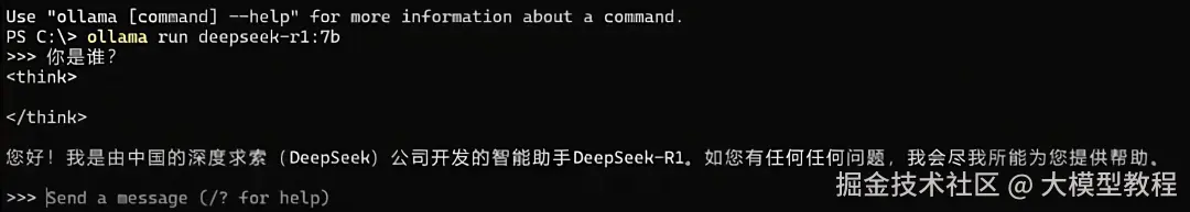 第一次运行会自动下载模型文件(可能需要几分钟到几十分钟,取决于你的网速和模型大小)。 完成后,你会看到命令行中出现三个箭头 >>>,意味着模型已经加载好,你可以直接在这里打字跟它对话了!