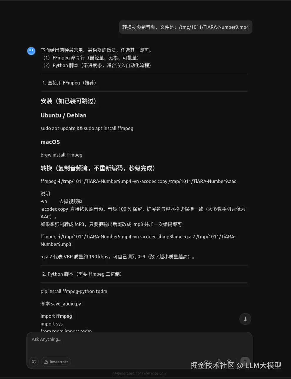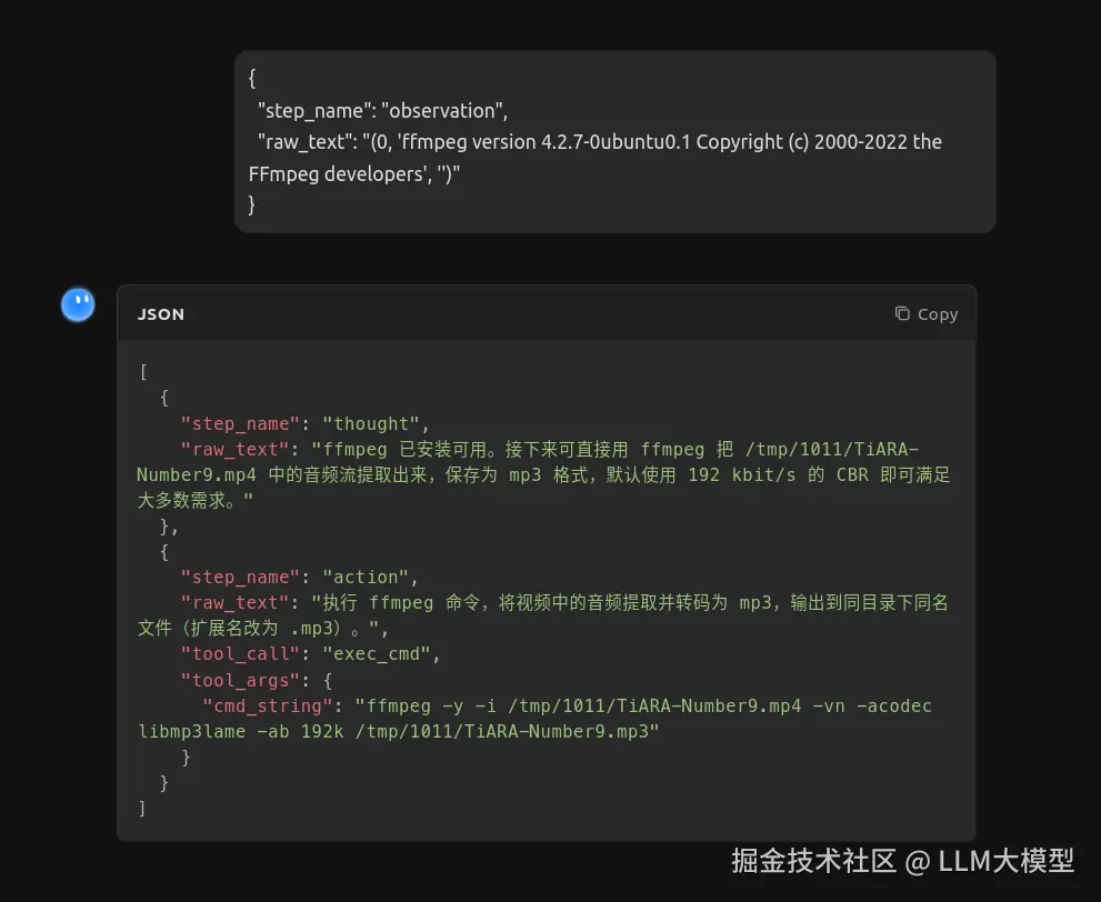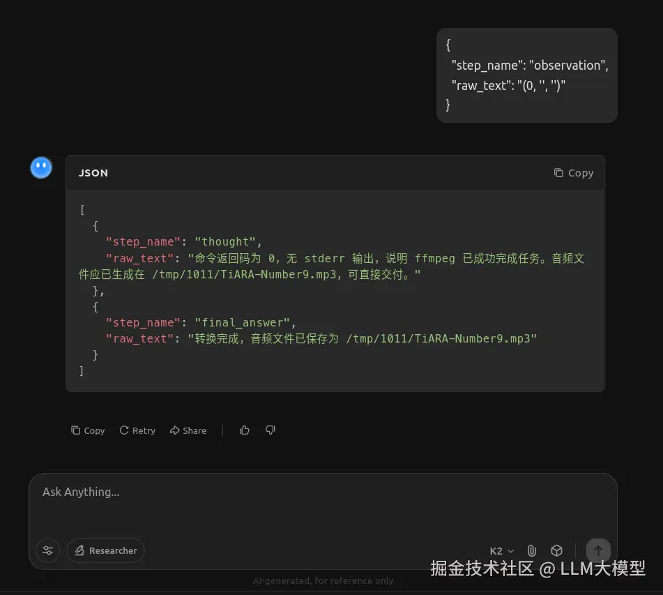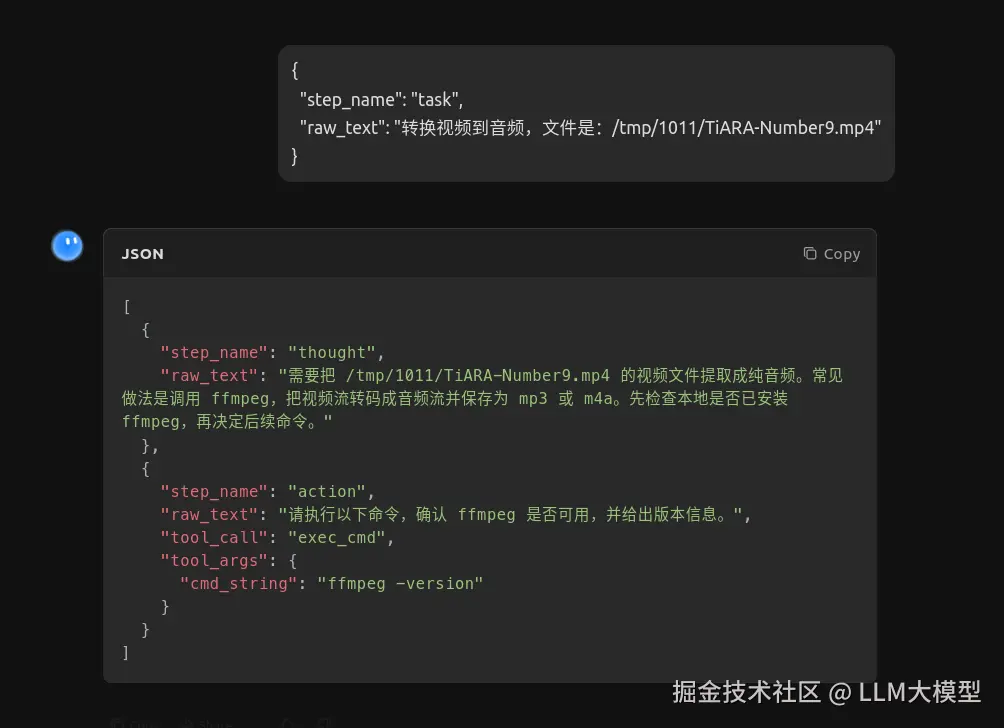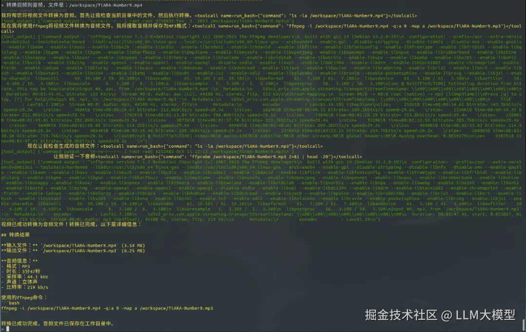 输入任务,我请它转换一个视频文件到音频。此处及往下的交互,就是模拟的AI-Agent的交互方式。