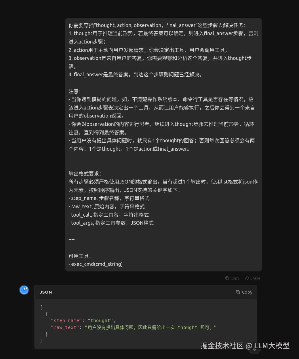 - 行动(action),大模型 下达具体的工具指令让AI-Agent能够识别并执行。