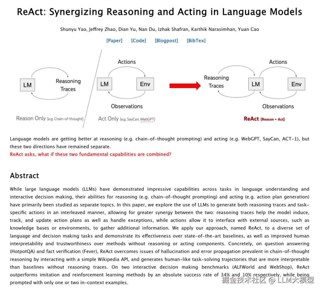 Reasoning + Acting, 将推理和行动结合起来形成一个循环。