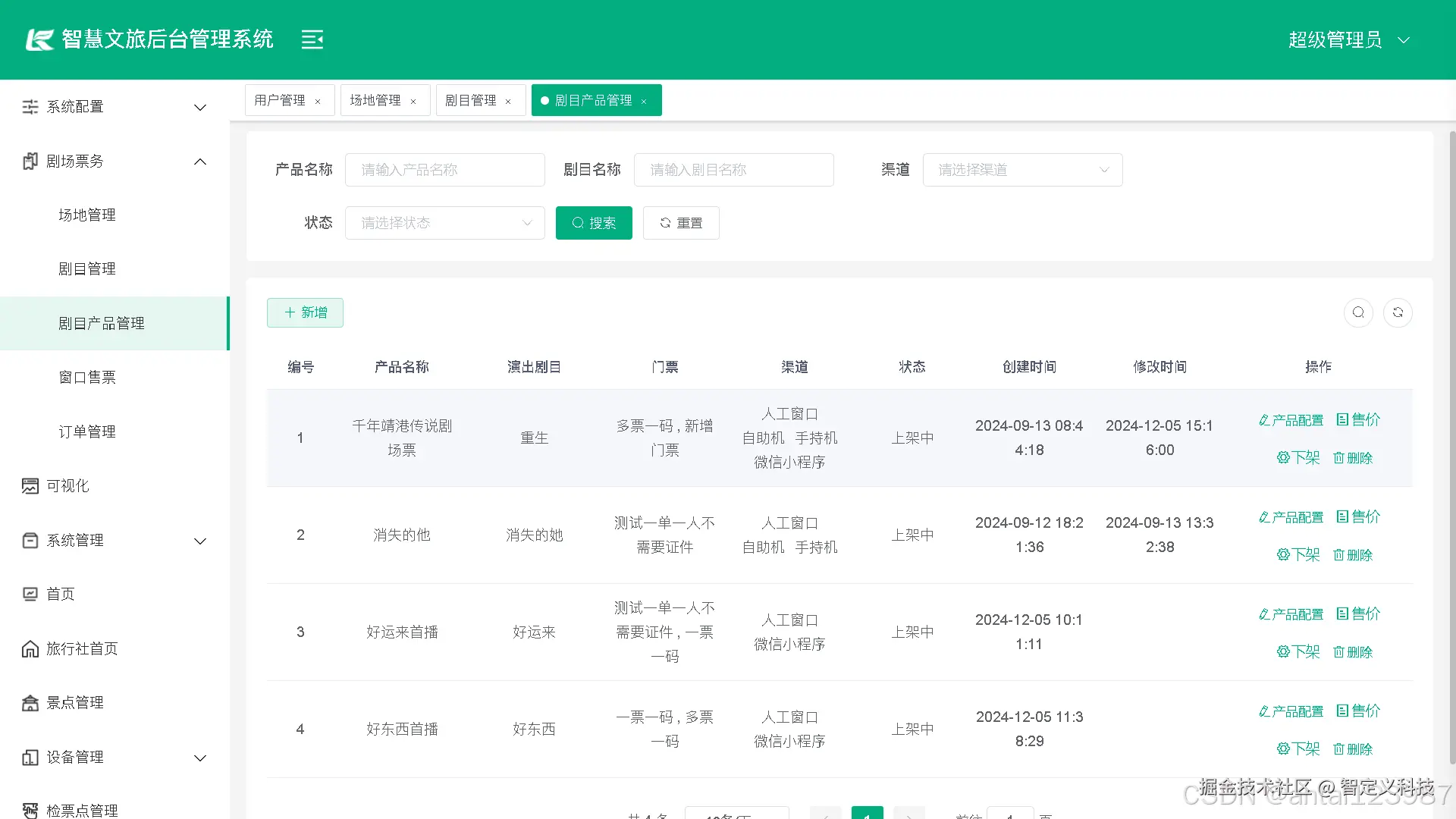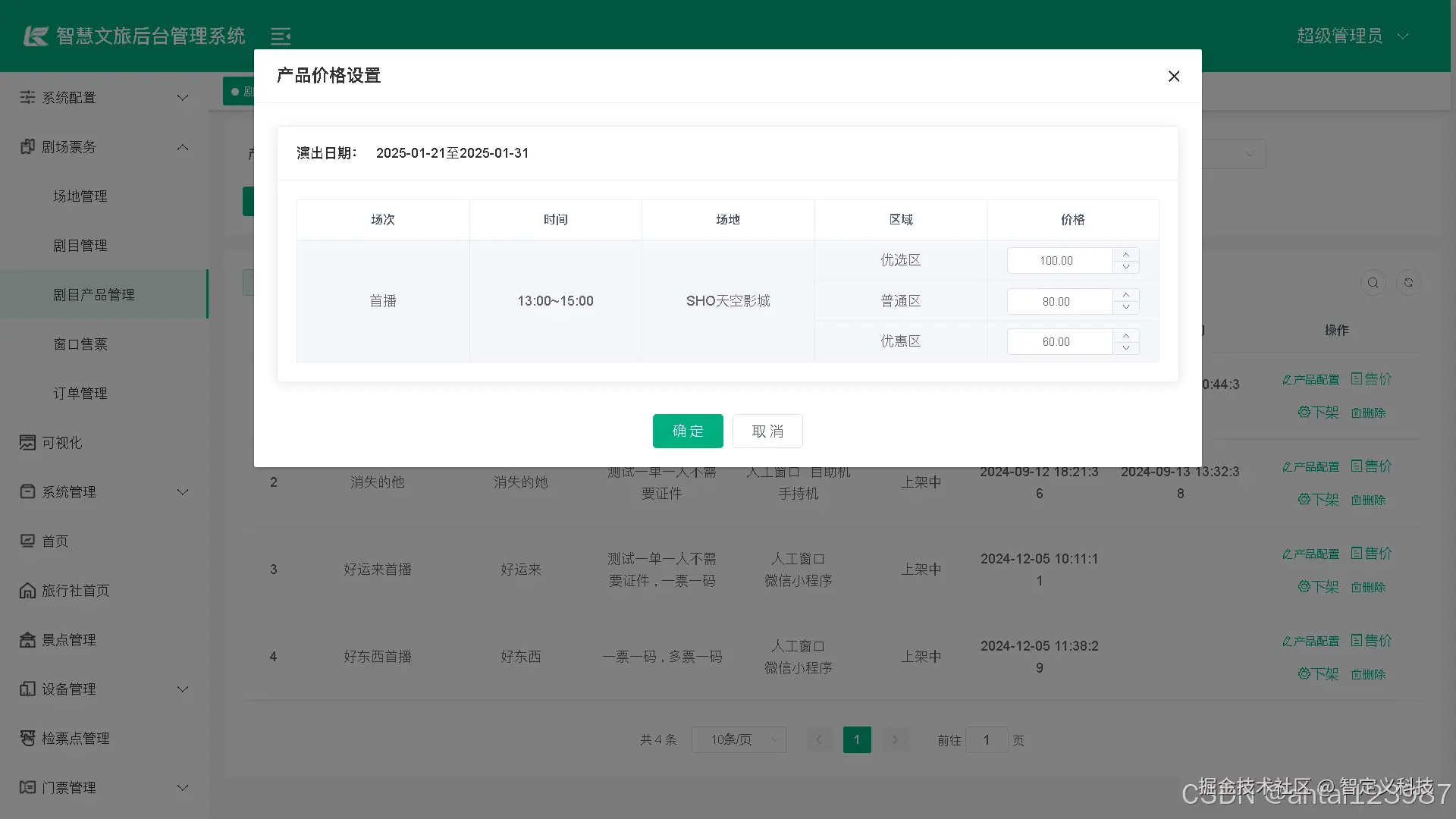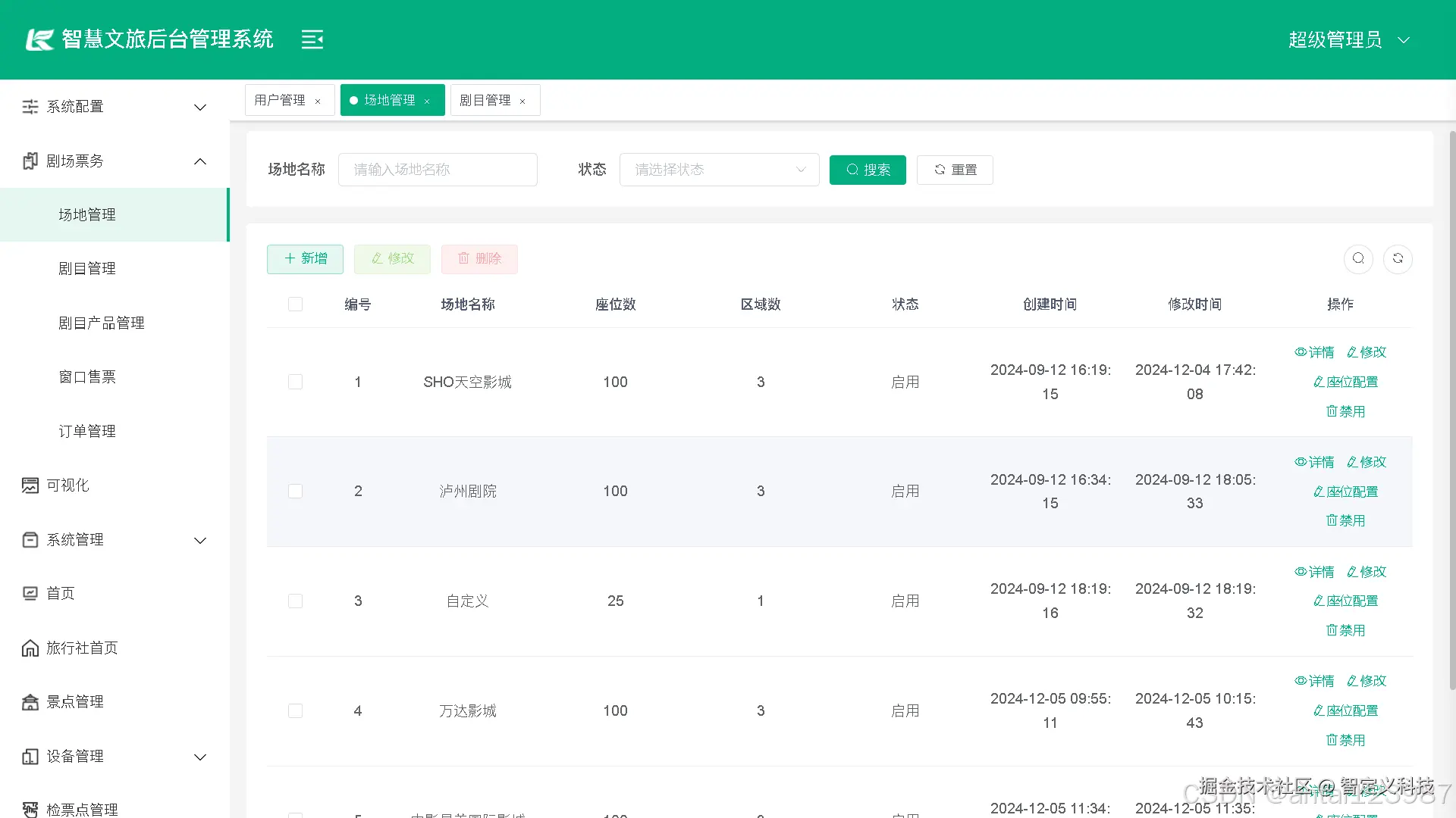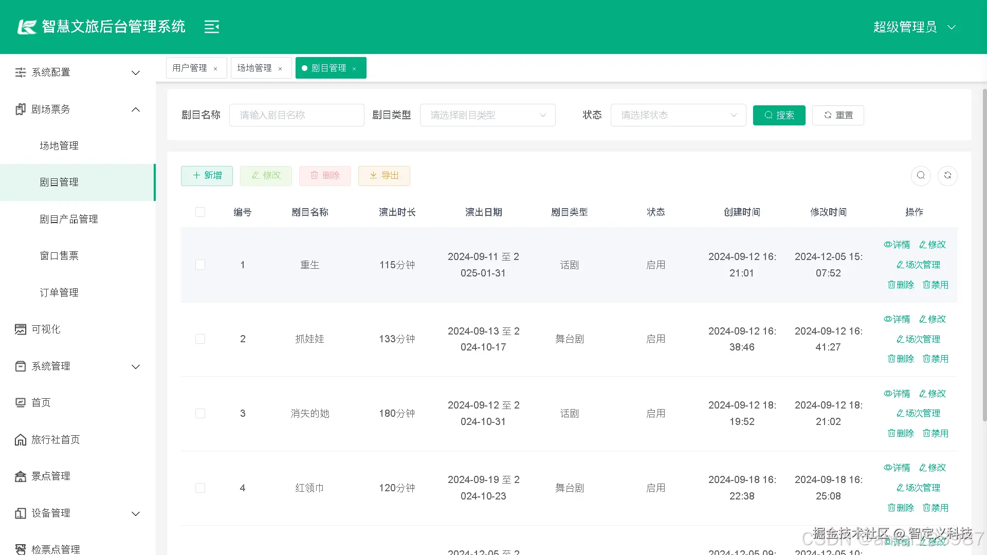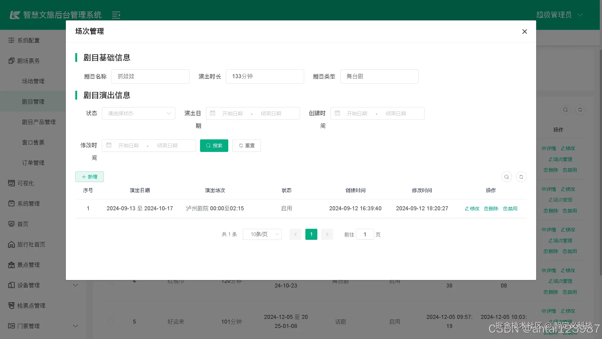 1、功能全面覆盖:涵盖场地管理(如刷目管理、产品管理、订单管理、窗口售票)、数据报表及小程序移动端等多模块,满足剧场运营全流程需求。