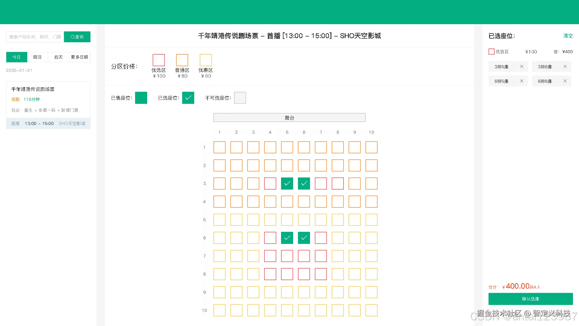 5、实时座位管理:提供直观的座位图显示,支持即时更新座位状态,确保座位信息准确无误,提升座位分配效率与观众体验。
