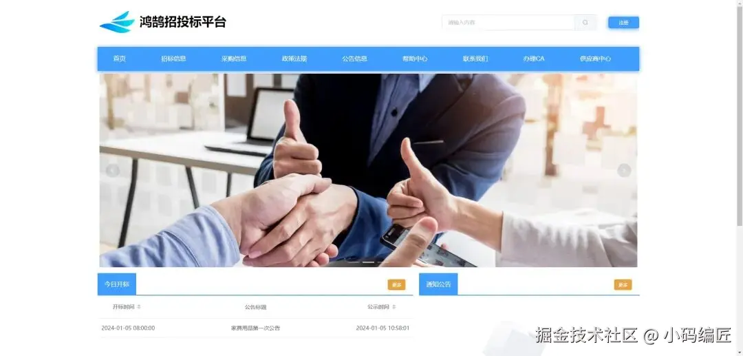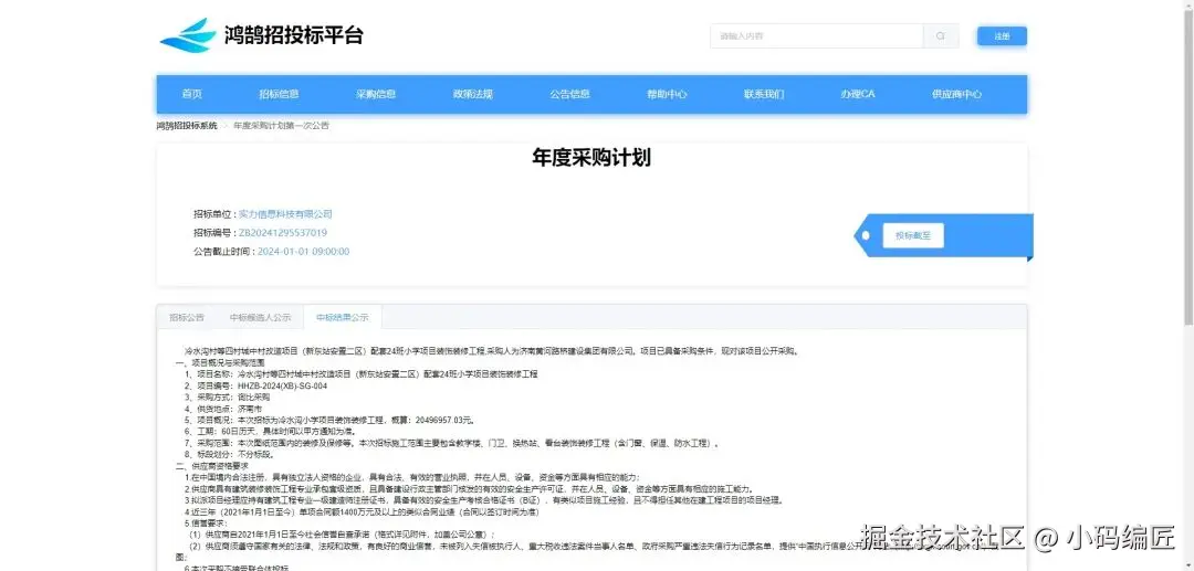 除了采购管理,系统还包含了一个完整的招投标平台,用于处理供应商的注册、投标等活动。