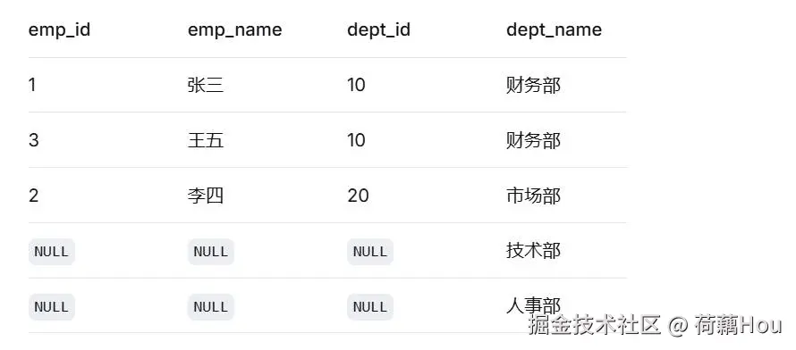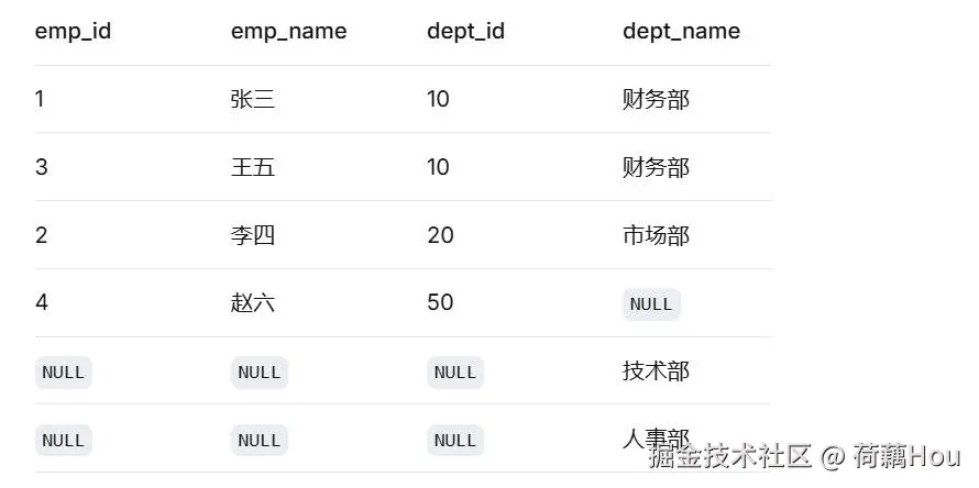 右表departments的所有记录都被返回。技术部和人事部在左表employees中没有匹配的员工,所以对应的员工信息为NULL。