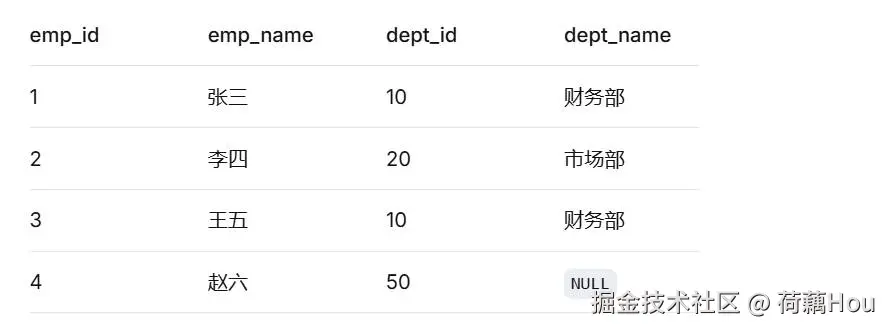 左表employees的所有记录都被返回。赵六的dept_id=50在右表departments中找不到匹配,所以其dept_name为NULL。