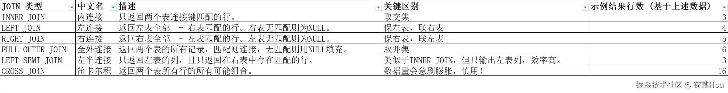 - 优先使用INNER JOIN或LEFT SEMI JOIN,它们通常更高效。