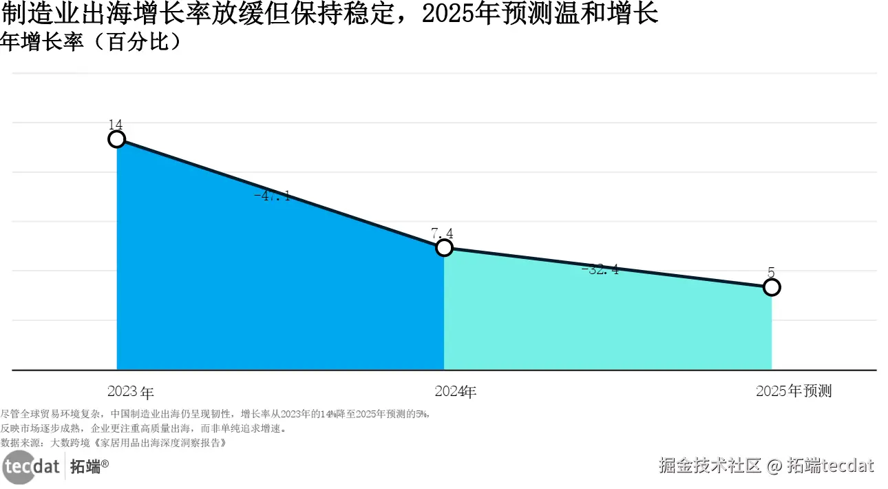 刚看到2023-2025年制造业出海增长率时,不少企业主会慌:2023年14%、2024年7.4%、2025年预测只剩5%(见图2)。但真不用焦虑,增速放缓的背后,是出海逻辑的切换——2024年出海企业平均利润率比2023年高了2.3个百分点,因为大家不再盲目冲规模,而是聚焦高附加值品类,比如带温度显示的智能不粘锅、可降解的高端清洁布,这些产品的溢价空间比普通款高30%以上。