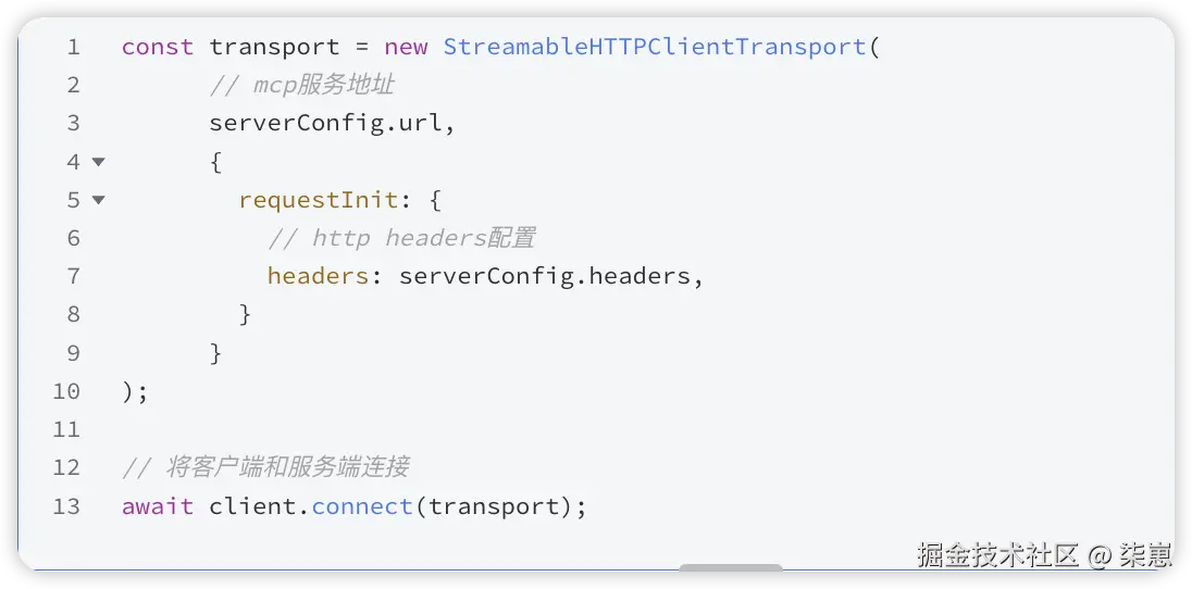 通过StreamableHTTPClientTransport连接到服务器,实现和服务的通信。