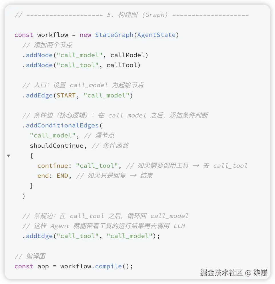call_tool之后,添加一条常规边,循环回call_model节点。这样,Agent 就能带着工具的运行结果再去调用 LLM,让 LLM 根据新信息进行下一步思考。