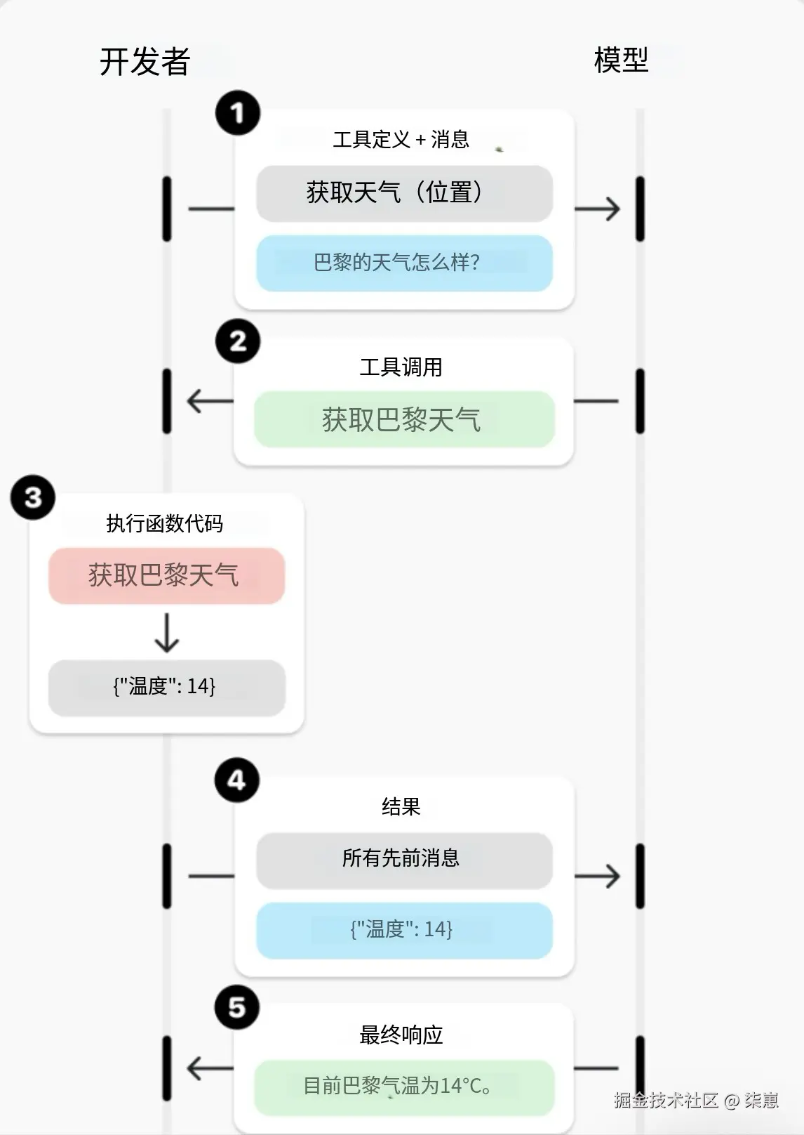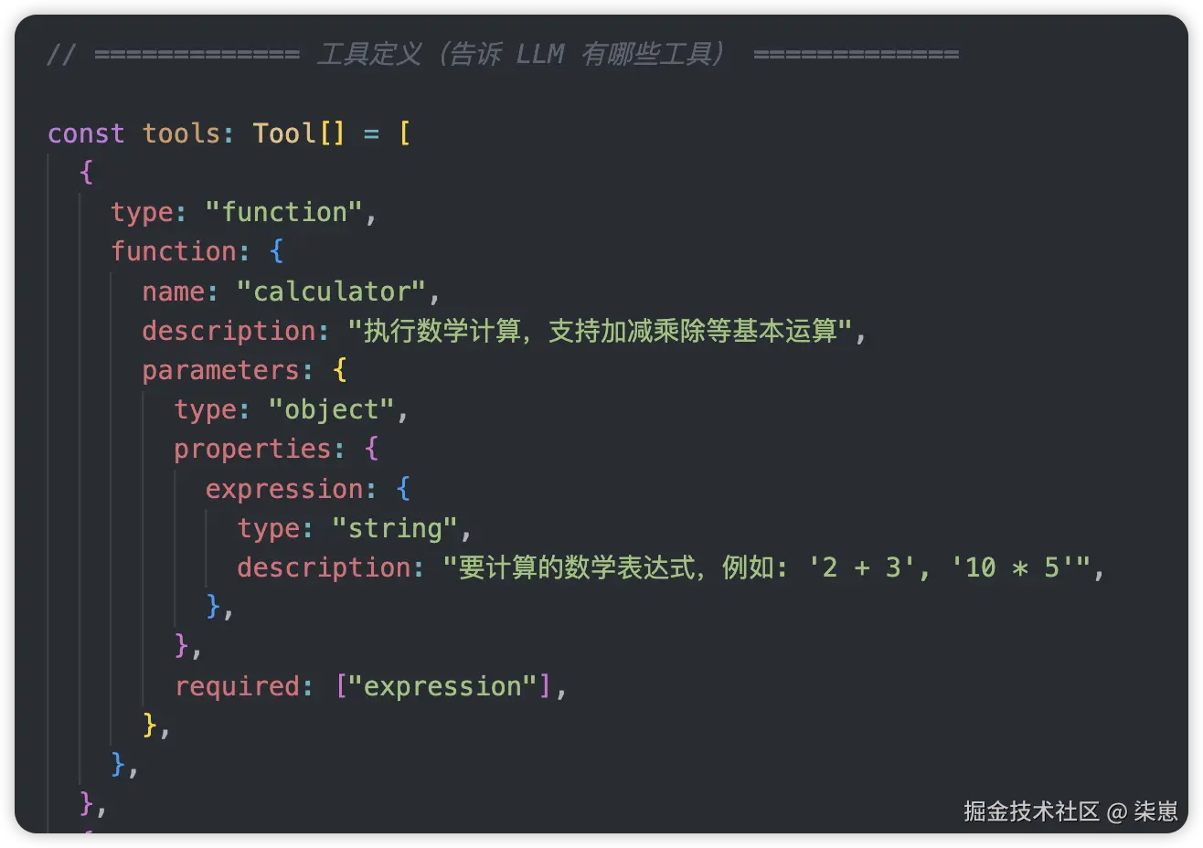 大模型的工具调用,使用JSON Schema 来定义参数结构,告诉大模型,有哪些工具使用,模型会根据用户的意图选择合适的工具调用。