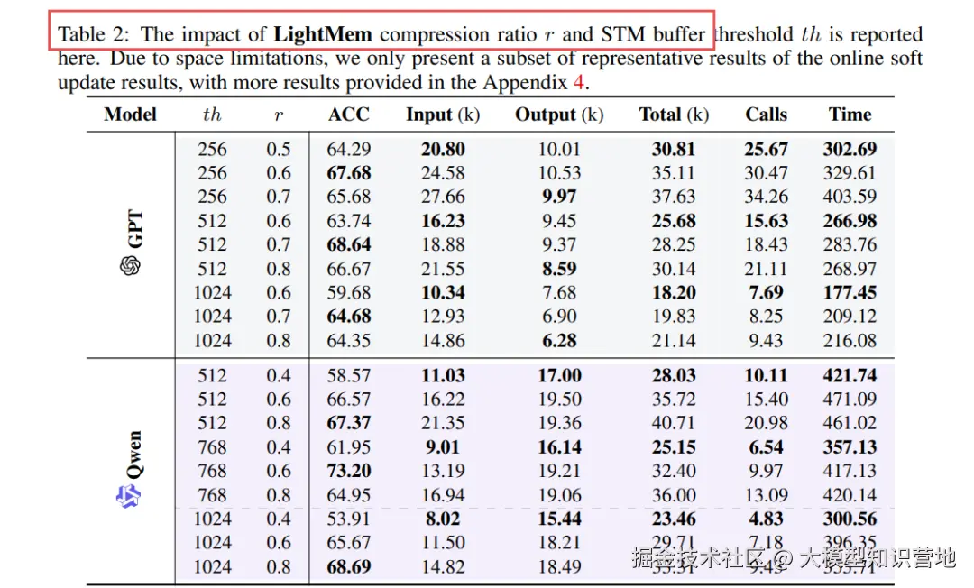 - r=0.6 + th=512 在 GPT 上取得最佳平衡点;Qwen 则偏好 r=0.6 + th=768。