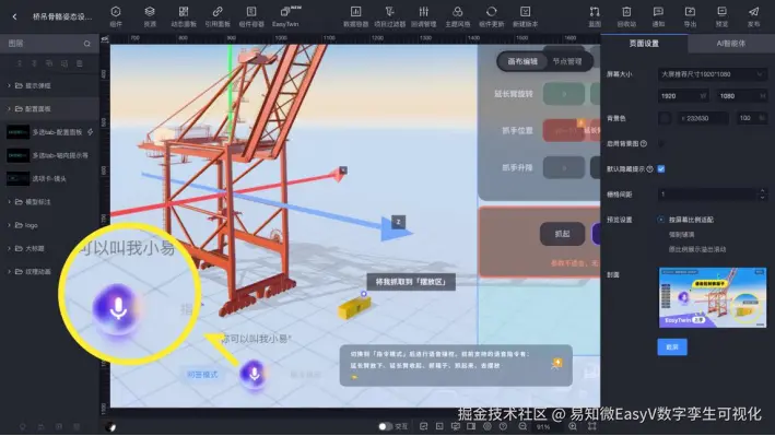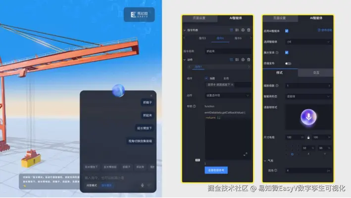 在 EasyV 最新发布的AI智能体中,提供语音指令功能。利用该功能,能实现“用嘴演示”。结合到港口业务中,即通过启用智能体、设置语音指令,可以直接用语音控制桥吊区抓取集装箱,摆放到对应位置。为了良好的用户体验以及更快响应客户的问题,在EasyV中采用了实时语音识别,将实时捕获的语音片段以二进制的形式发送给服务端识别。