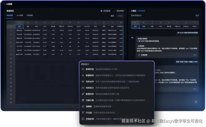 EasyV数字孪生可视化平台基于每一个数据集的语义,通过语音交互识别用户查询意图,检索查询的某个或多个数据集,然后通过模型调用,返回数据结果。基于数据集中查询的数据,形成了智慧看数的基础,模型在图表库中匹配的图表最终用于可视化展示。