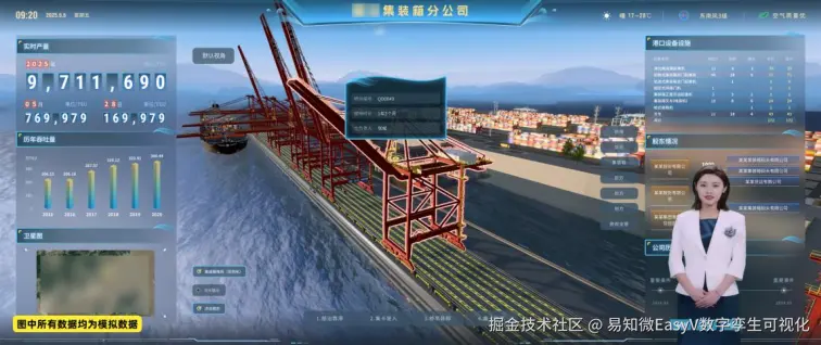 当点击某个桥吊设备时,可使用数字人功能进行设备详情的播报: