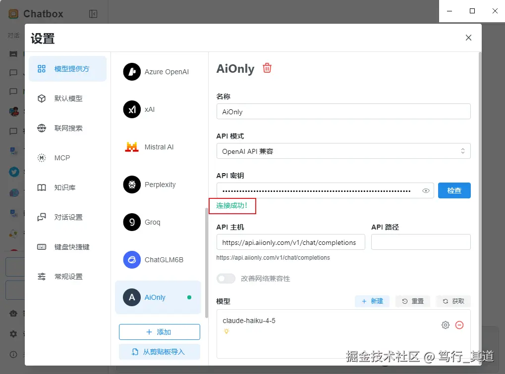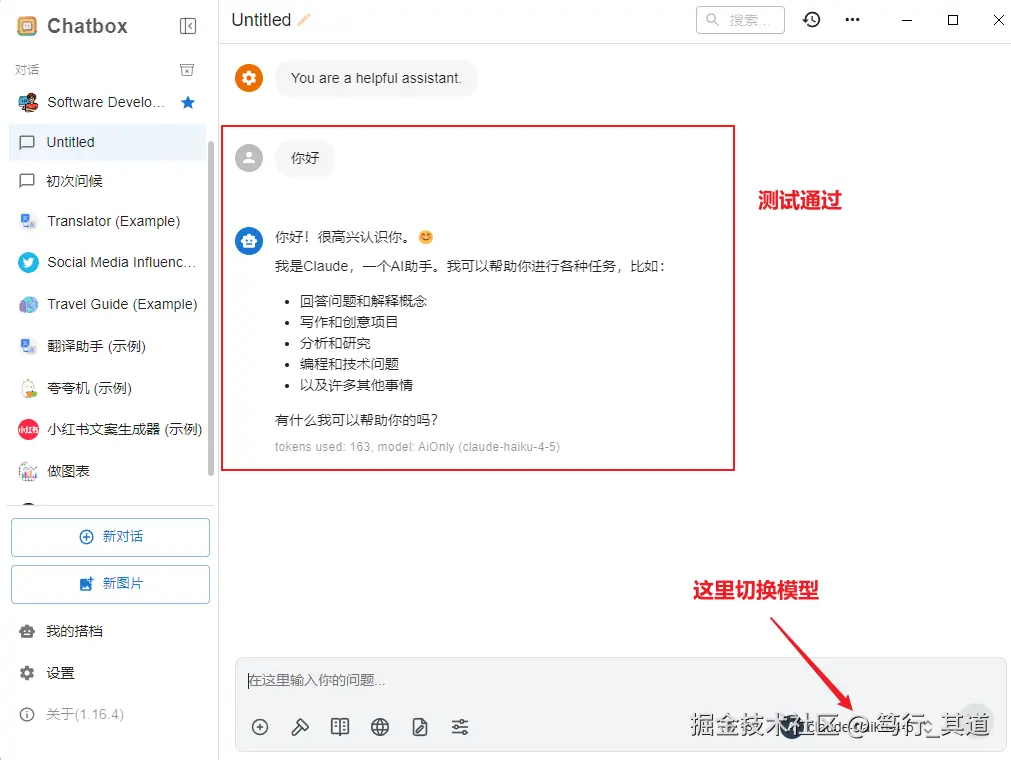 第七步:创建一个新对话,使用AiOnly的Claude Haiku 4.5模型,如下图所示已经测试成功